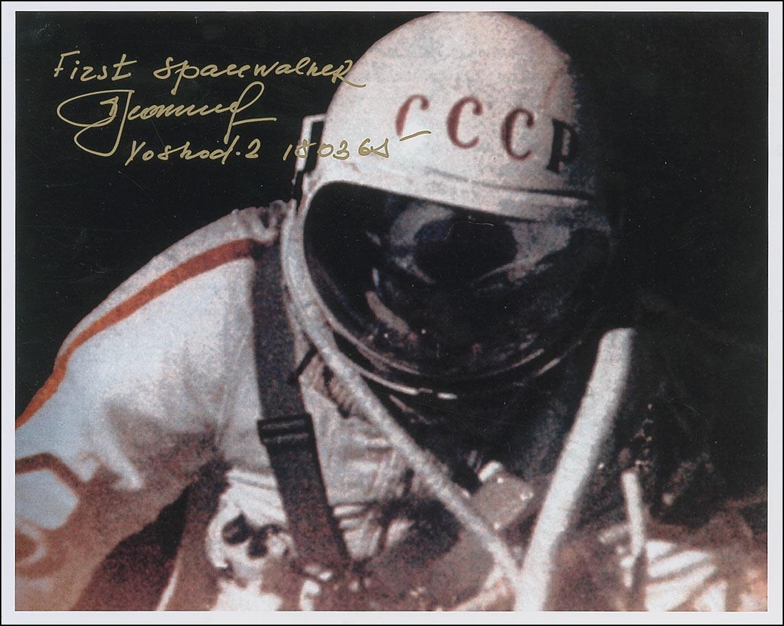 Color satin-finish 10 x 8 photo, signed in Cyrillic in gold ink by Leonov, adding “First spacewalker Voshkod 2, 18.03.65.” In very fine condition.