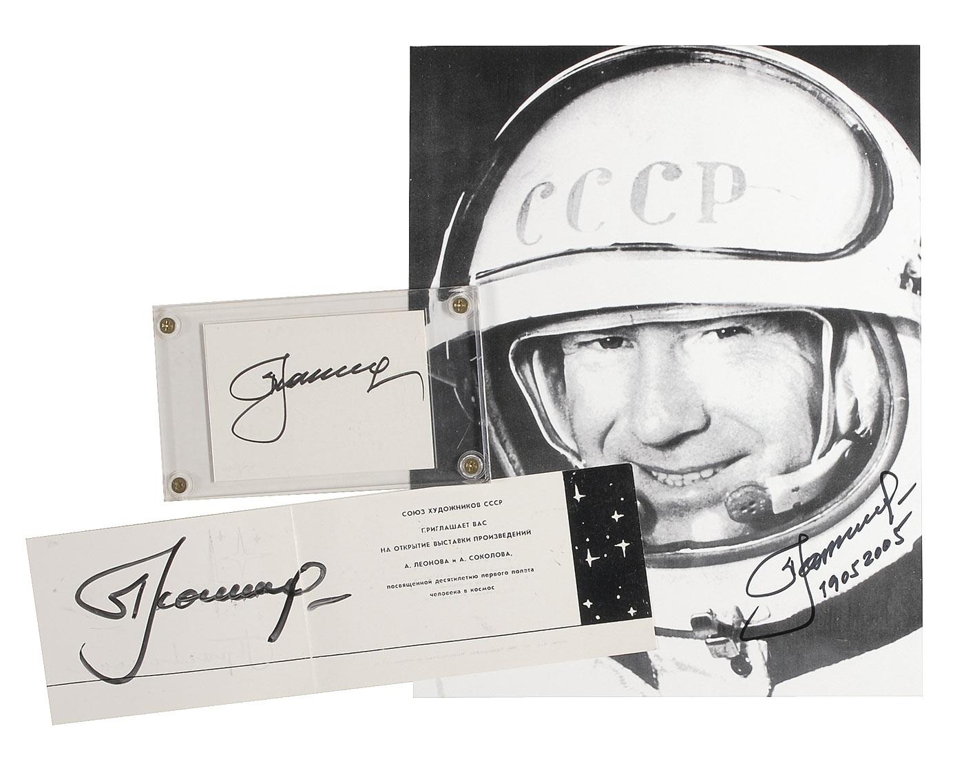 Retired Soviet/Russian cosmonaut and Air Force Major General who, in 1965, became the first human to conduct a space walk. Three items: semi-gloss cardstock 8 x 10.5 photo of Leonov in his cosmonaut helmet signed in black felt tip “Alexei Leonov 19 05 2005”; unique 5.5 x 3 card printed in Russian and signed inside in black felt tip; and a black felt tip signature on a 3.5 x 2.5 off-white card. In overall fine condition with mild soiling to the printed card and the end of Leonov’s signature crossing the central vertical fold.
