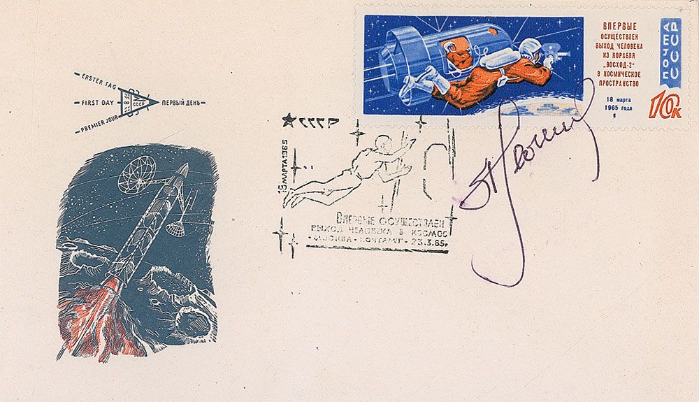 Commemorative cover with a cachet honoring Russian space flight, signed in black ballpoint. In fine condition, with a couple trivial brushes to signature.