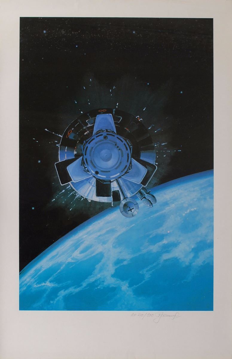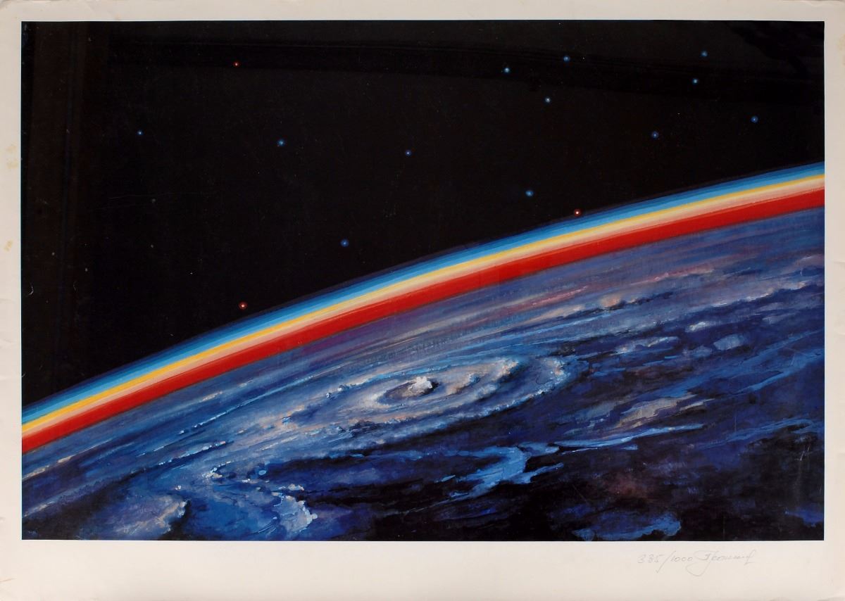Two gorgeous celestial prints by famed cosmonaut and artist Alexei Leonov: a color limited edition 24 x 37 print depicting the approaching Apollo command module from the perspective of the Soyuz crew, numbered “AP 210/500,” and signed in the lower border in pencil; and a color limited edition 38.5 x 27.25 print of a painting entitled ‘Southern Rage—Sunrise,” showing a vibrant rainbow curling along the Earth’s edge, numbered “335/1000,” and signed in the lower border in pencil. Both are rolled and in fine condition, with some light creasing.
