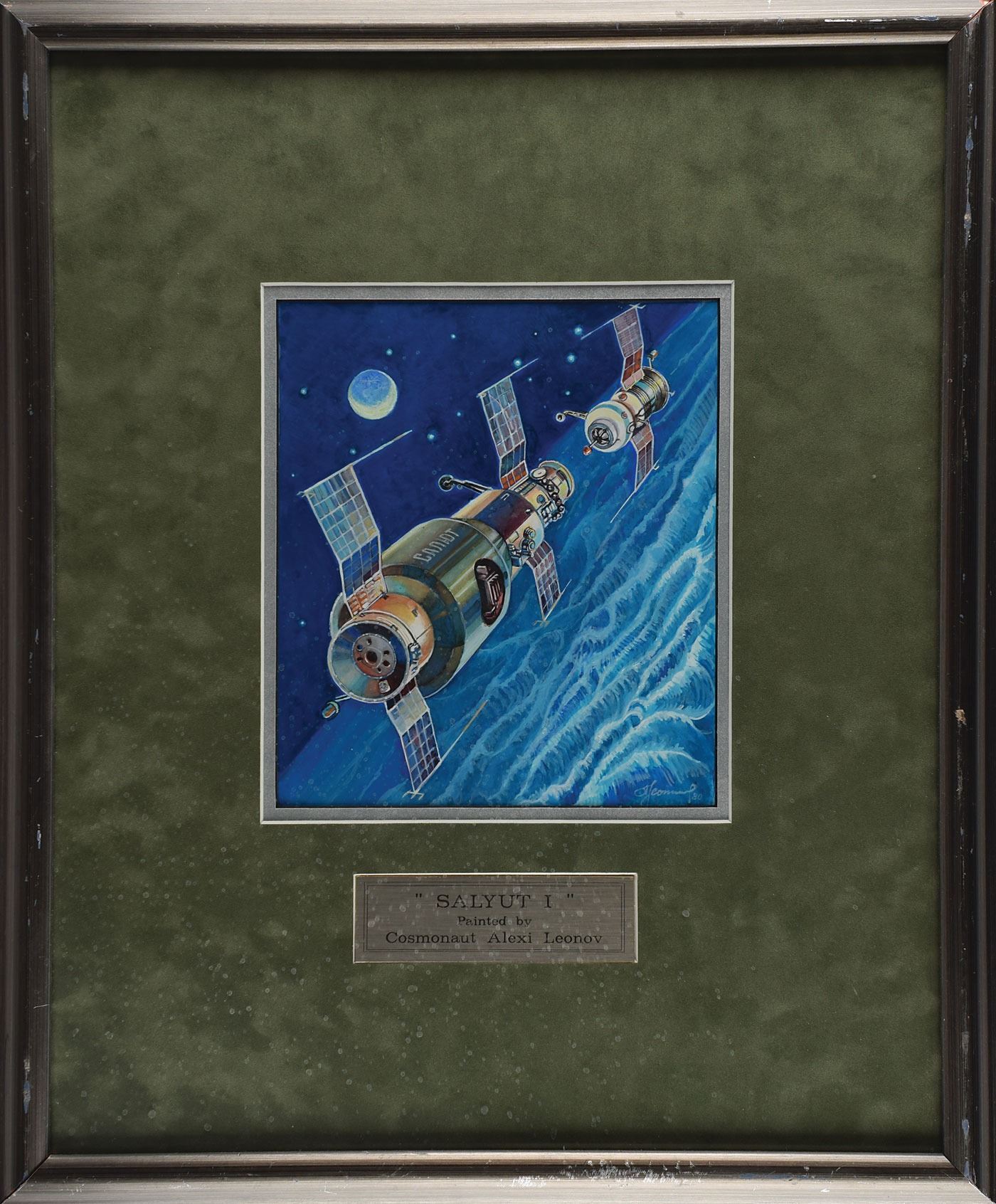 Excellent original 1980 painting by Voskhod 2 spacewalker Alexei Leonov entitled 'Salyut I," accomplished in oil on a 8 x 9.25 sheet of cold press illustration board. The work depicts the moment before the Salyut 1 space station docked with the Soyuz 10 spacecraft on April 24, 1971. Signed in the lower right in gray paint by Leonov. Double-matted and framed with a plaque to an overall size of 18.5 x 22. In fine condition.