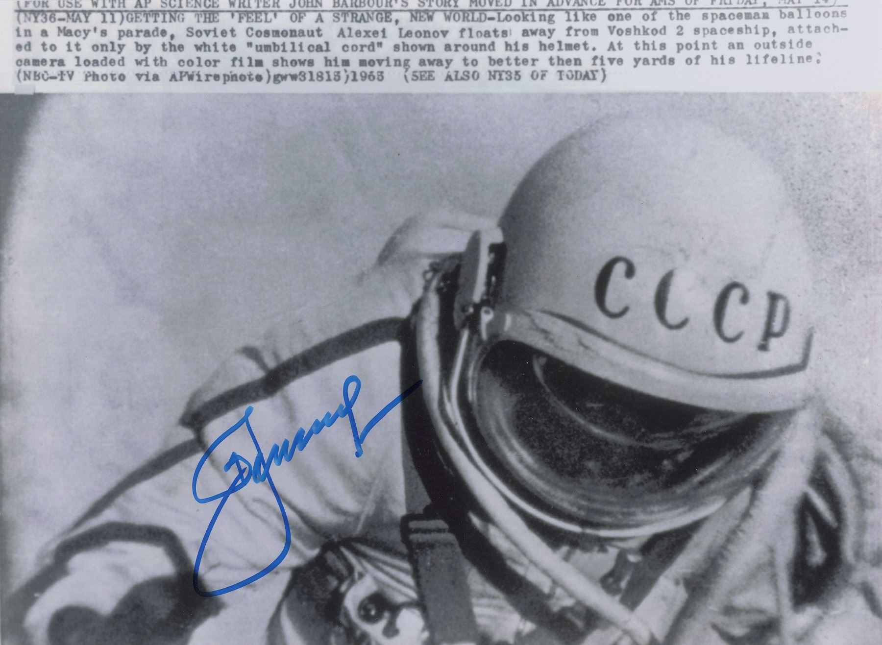 Glossy 10.75 x 8 photo of Leonov performing his historic first spacewalk, signed in blue felt tip. A typed press caption is inherent to the reprinted image. In fine condition.
