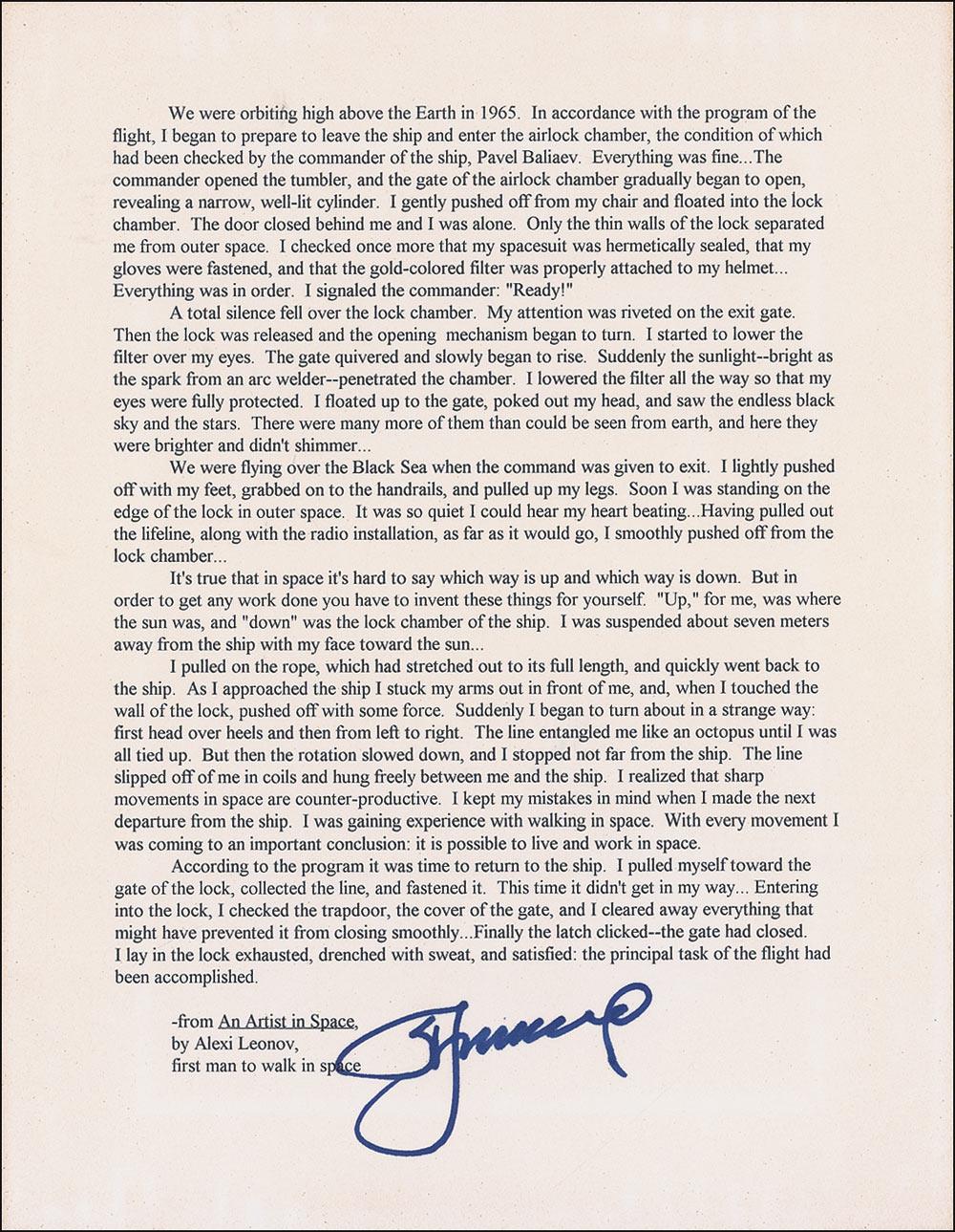 Souvenir typescript, one page, 8.5 x 11, signed at the conclusion in blue felt tip. An excerpt from “An Artist in Space,” recounting his spacewalk, which reads, in part: “We were flying over the Black Sea when the command was given to exit. I lightly pushed off with my feet, grabbed on to the handrails, and pulled up my legs. Soon I was standing on the edge of the lock in outer space. It was so quiet I could hear my heart beating…Having pulled out the lifeline, along with the radio installation, as far as it would go, I smoothly pushed off from the lock chamber.” In very fine condition. Pre-certified Scott Cornish and RRAuction COA.