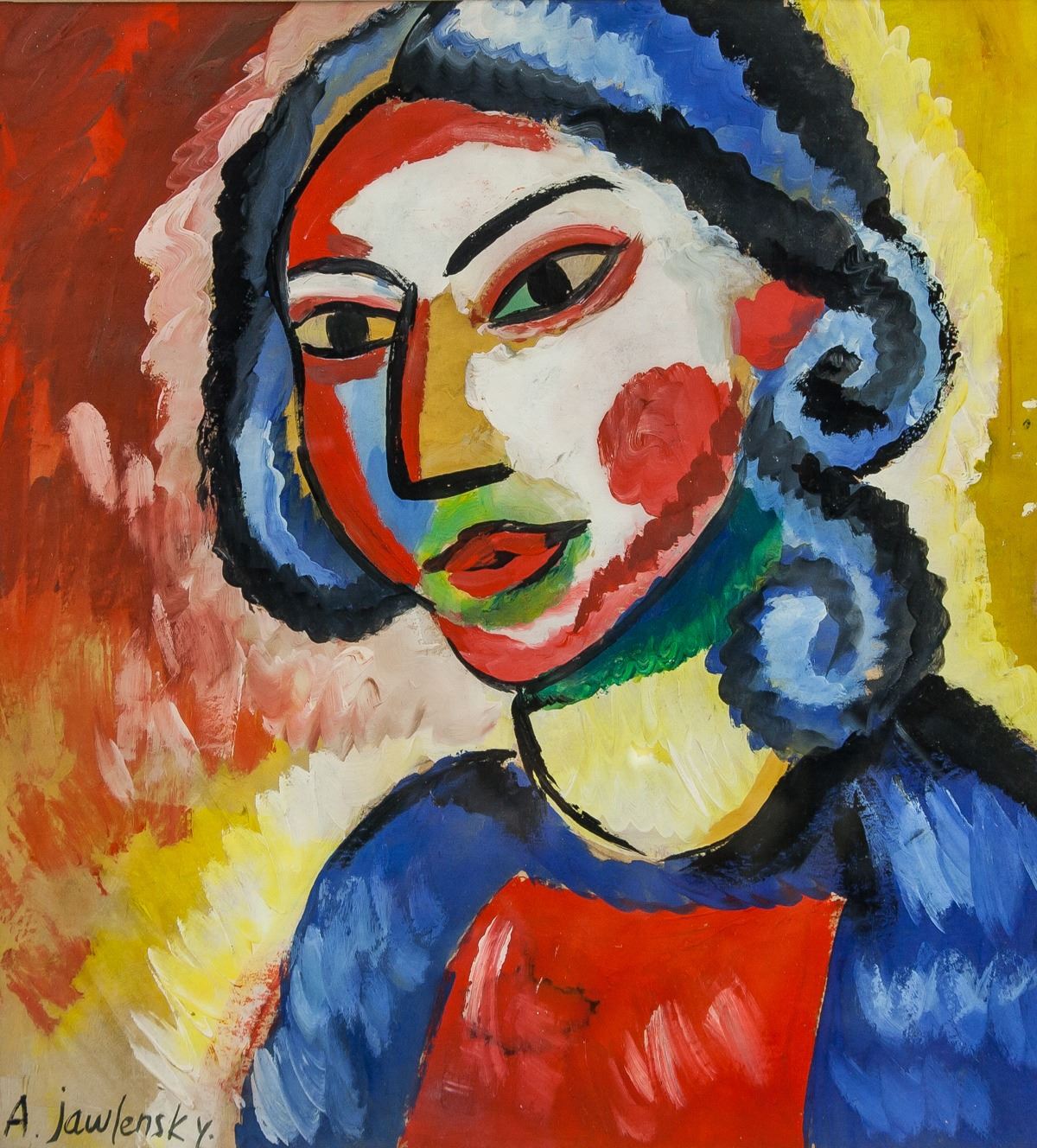 Alexej von Jawlensky (Russian, 1864-1941) was born in Torzhok, a town in Tver Governorate, Russia, as the fifth child of Georgi von Jawlensky and his wife Alexandra. He moved to Munich in 1894, where he studied in the private school of Anton Azbe. In 1905 Jawlensky visited Ferdinand Hodler, and two years later he began his long friendship with Jan Verkade and met Paul Serusier. Together, Verkade and Serusier transmitted to Jawlensky both practical and theoretical elements of the work of the Nabis, and Synthetist principles of art. In Munich he met Wassily Kandinsky and various other Russian artists, and he contributed to the formation of the Neue Kunstlervereinigung Munchen. His work in this period was lush and richly coloured, but later moved towards abstraction and a simplified, formulaic style. Between 1908 and 1910 Jawlensky and Werefkin spent summers in the Bavarian Alps with Kandinsky and his companion, the painter Gabriele Munter. Here, through painting landscapes of their mountainous surroundings, they experimented with one another’s techniques and discussed the theoretical bases of their art. Following a trip to the Baltic coast, and renewed contact with Henri Matisse in 1911 and Emil Nolde in 1912, Jawlensky turned increasingly to the expressive use of colour and form alone in his portraits.