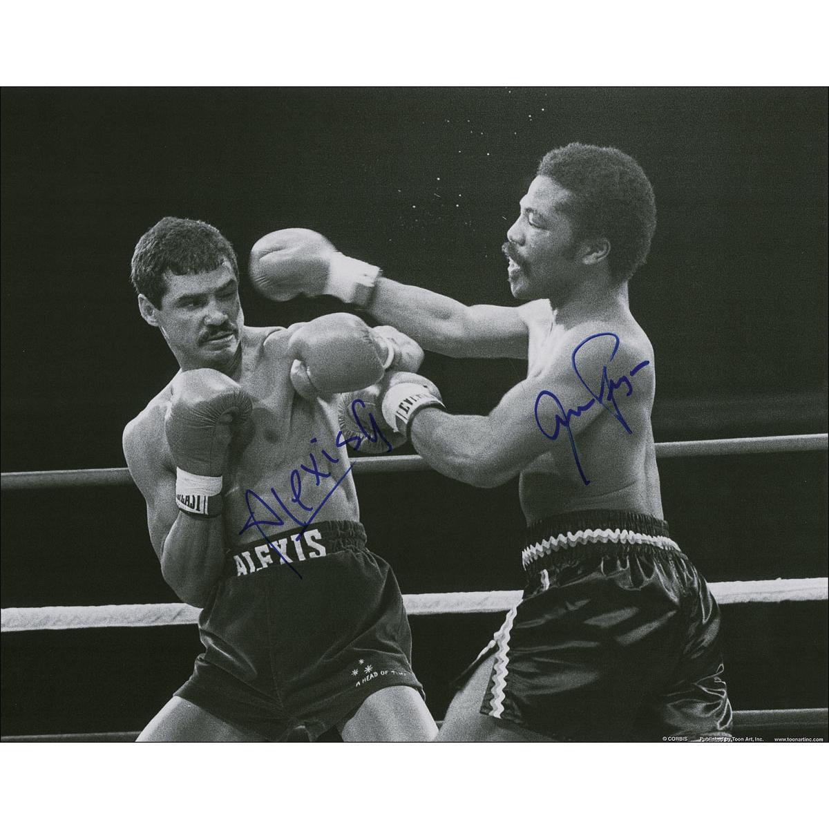 Intense 14 x 11 cardstock photo of Arguello and Pryor going toe-to-toe in the ring in 1983, signed by both in blue felt tip. In very fine condition.