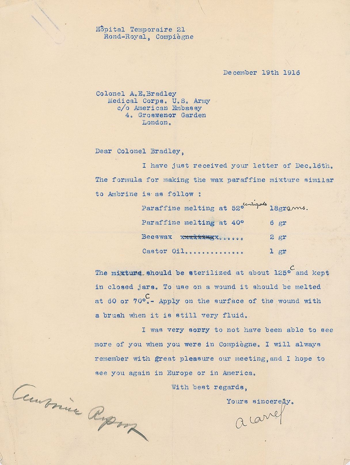 World War I-dated TLS signed “A. Carrel,” one page, 8.25 x 11, December 19, 1916. Written from the "Hopital Temporaire 21, Rond-Royal, Compiegne," a letter to Colonel A. E. Bradley of the U.S. Army Medical Corps, providing the formula for treating battle wounds, in full: "I have just received your letter of Dec. 16th. The formula for making the wax paraffine mixture similar to Ambrine is as follow:
