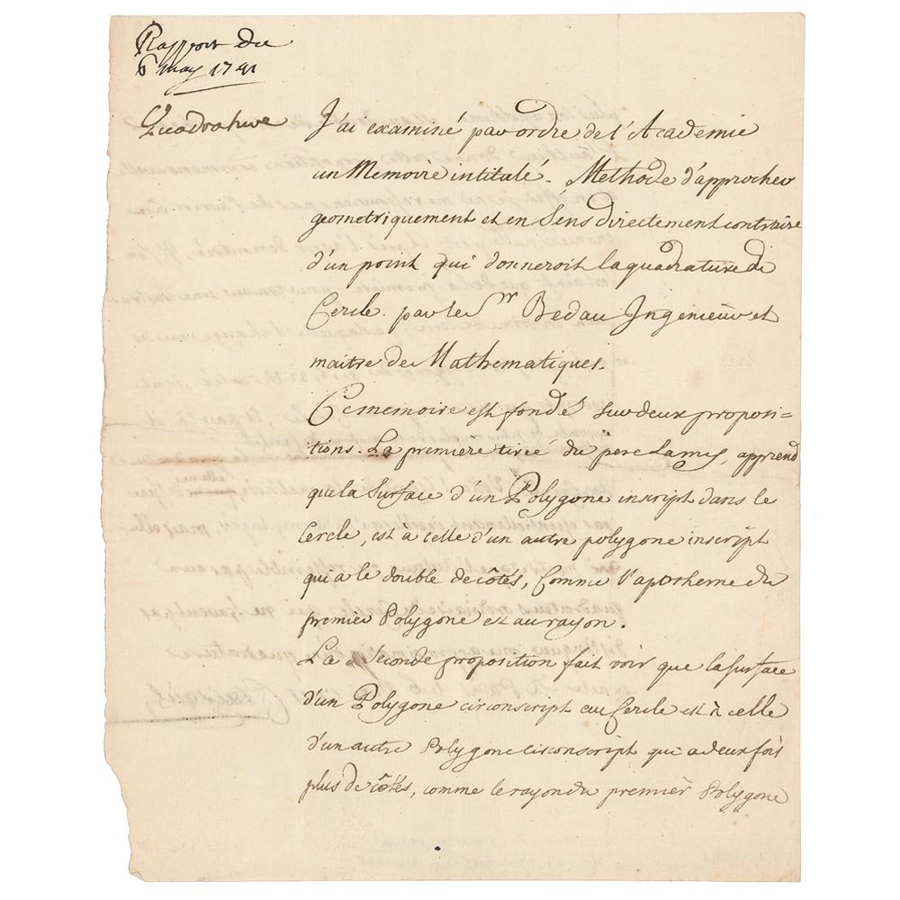 ADS in French, signed “Clairaut,†one page, 6.5 x 8, May 6, 1741. Document stating that he has examined, for the Academie, a "Memoire intitulé Methode d'approcher geometriquement et en Sens directement contraire d'un point qui donneroit la quadrature du Cercle" [Method of approaching geometrically and in sense directly opposite of a point which would give the squaring of the Circle] by Mr. Bedau. Clairaut credits the author with some originality of thought but is not overly impressed by his propositions. In fine condition.