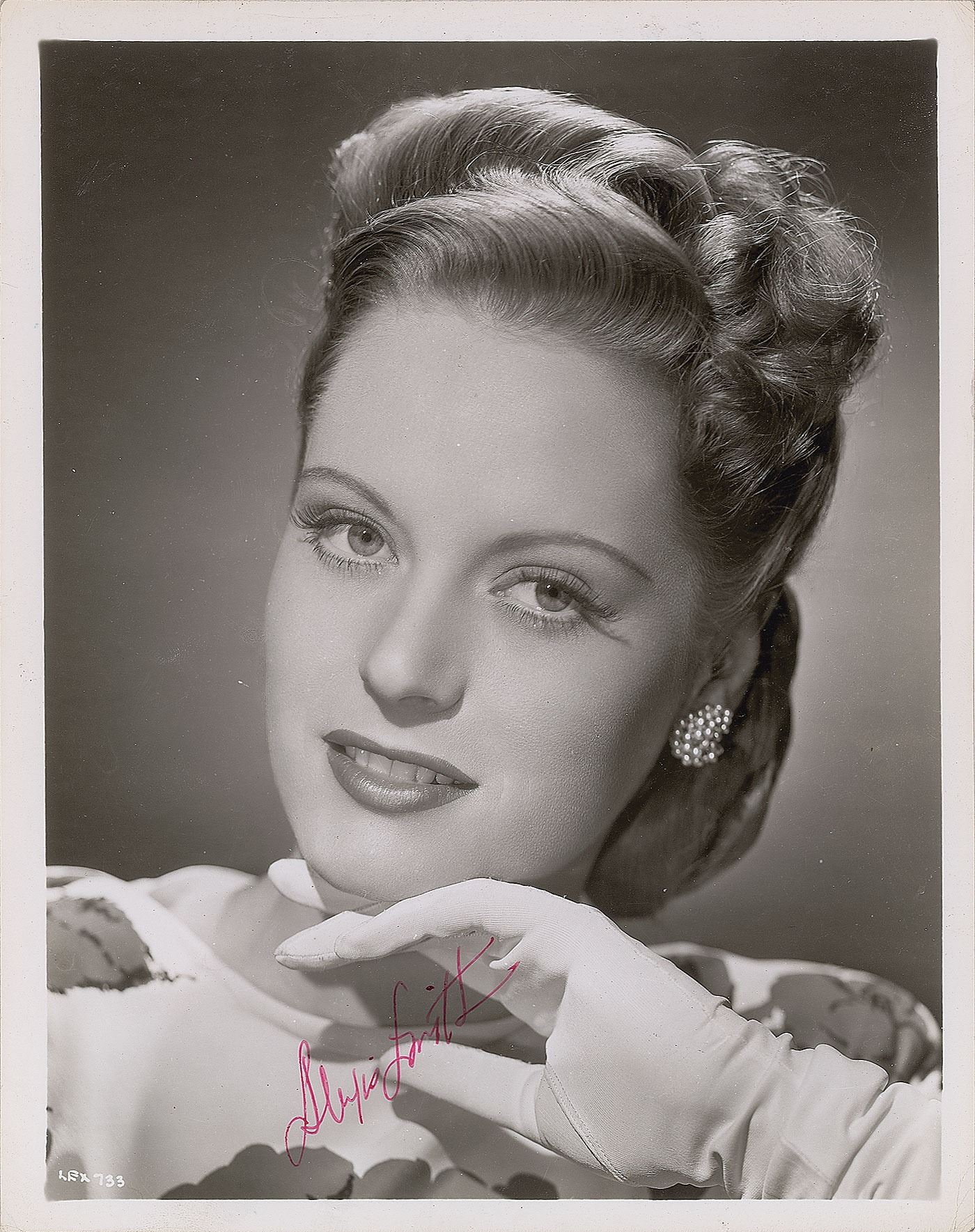 Canadian-born stage, film, and television actress and singer (1921–1993) who appeared in films like Gentleman Jim, The Adventures of Mark Twain, Conflict, and Here Comes the Groom. Vintage 8 x 10.25 studio portrait of Smith in an elegant close-up pose, signed in red fountain pen. In fine condition, with scattered light crazing.