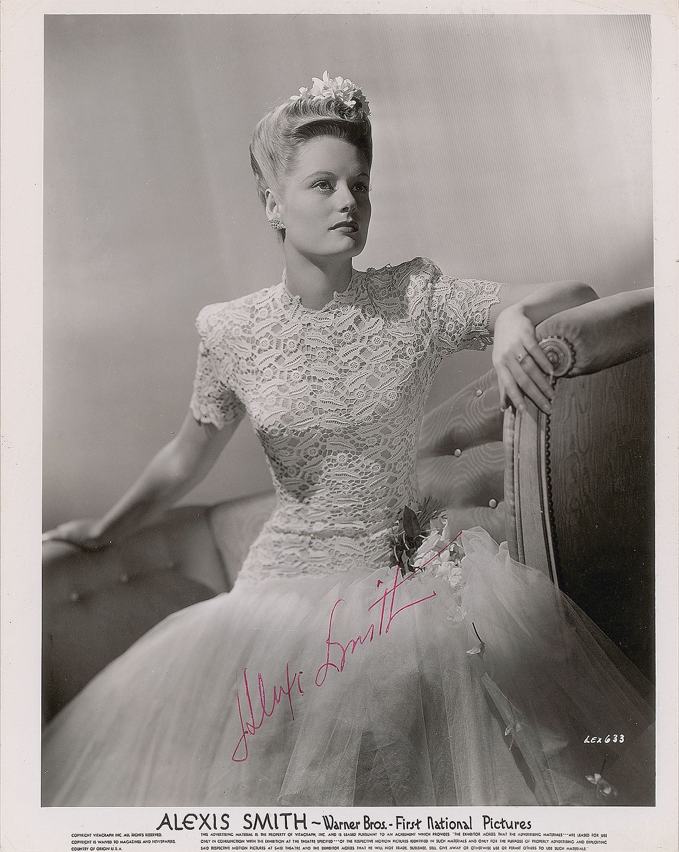 Canadian-born stage, film, and television actress and singer (1921–1993) who appeared in films like Gentleman Jim, The Adventures of Mark Twain, Conflict, and Here Comes the Groom. Vintage glossy 8 x 10 Warner Bros. and First National Pictures publicity photo of Smith seated and wearing a gorgeous white dress, signed in red fountain pen. In fine condition, with scattered light crazing to the emulsion.
