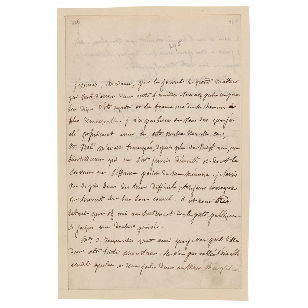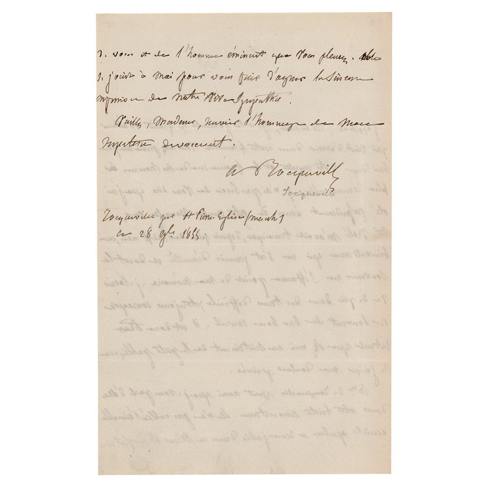 ALS in French, signed “A. de Tocqueville,†one page both sides, 5 x 8.25, November 28, 1855. Untranslated handwritten letter by Alexis de Tocqueville. In fine condition, with the blank integral sheet inlaid into a slightly larger page.