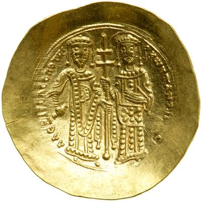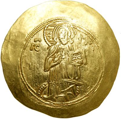 Alexius III, 1195-1203. Gold hyperpyron (4.1 g). Mint of Constantinople. Christ stg. facing on dias, wearing nimbus, raising r. hand in benediction; in l. book of Gospels. Reverse: Alexius (on l.) and St. Constantine, bearded, crowned (on r.), both stg. facing, holding between them long patriarchal cross; the emperor wears crown. S-2007. Extremely Fine.