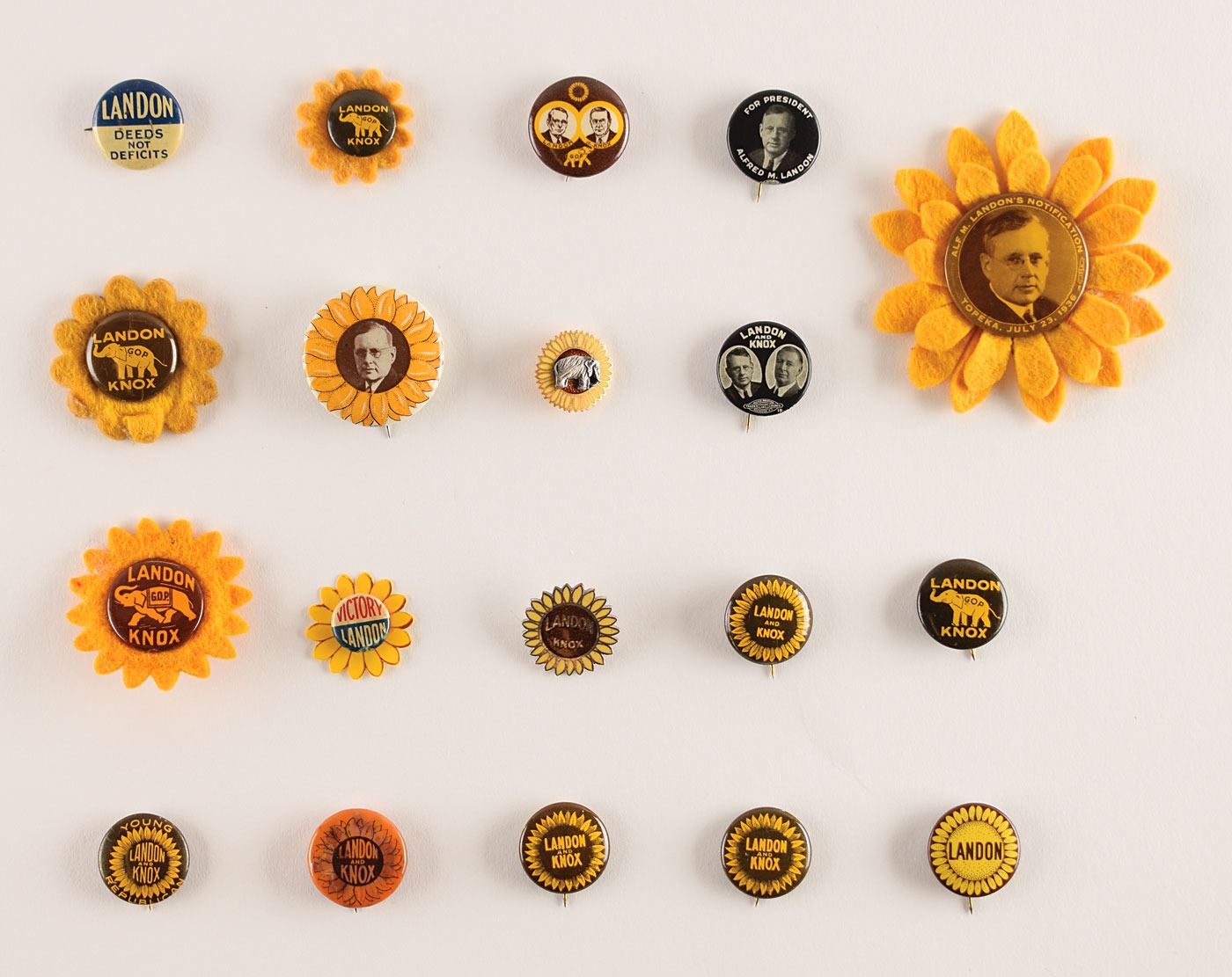 Collection of 19 pins associated with Alf Landon and his 1936 presidential campaign, most invoking a sunflower motif as he was governor of Kansas, the 'Sunflower State'; four retain their original cloth sunflower backers. Includes: two jugate portraits of Landon and vice presidential running mate Frank Knox; three portraits of Landon alone; and several variants of the GOP elephant and/or their names, encircled by sunflowers. In overall fine condition. The incumbent FDR handily defeated Landon in the election, taking 46 states (including Kansas) to Landon's two.