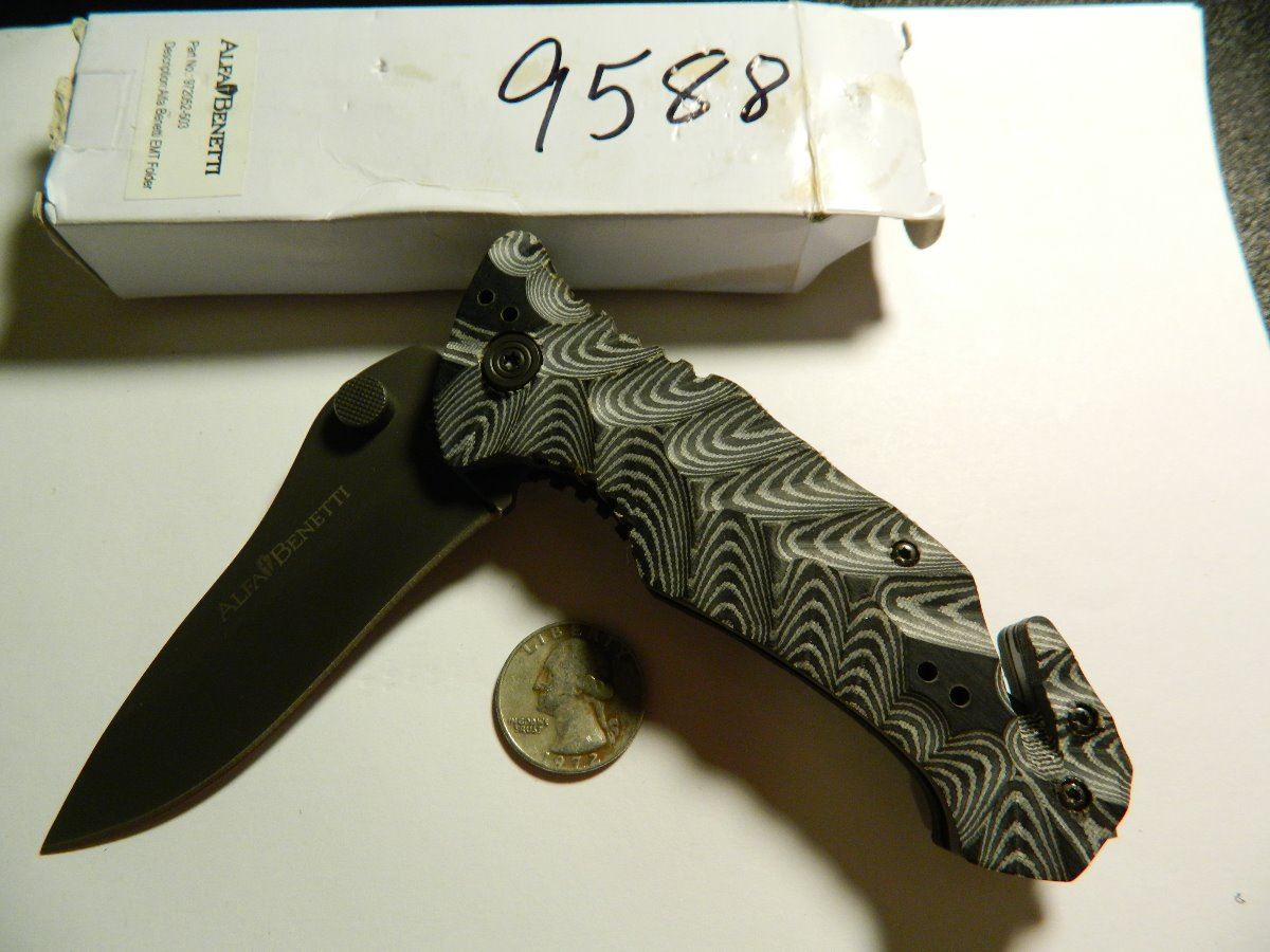 Tactical EMT Folder - 5" closed linerlock. 3 1/2" titanium finish stainless blade with oversized dual thumb studs and extended tang. Black aggressive grooved G-10 handles with thumb ridge, integrated seat belt cutter and glass breaker. Reversible titanium finish stainless wire pocket clip.