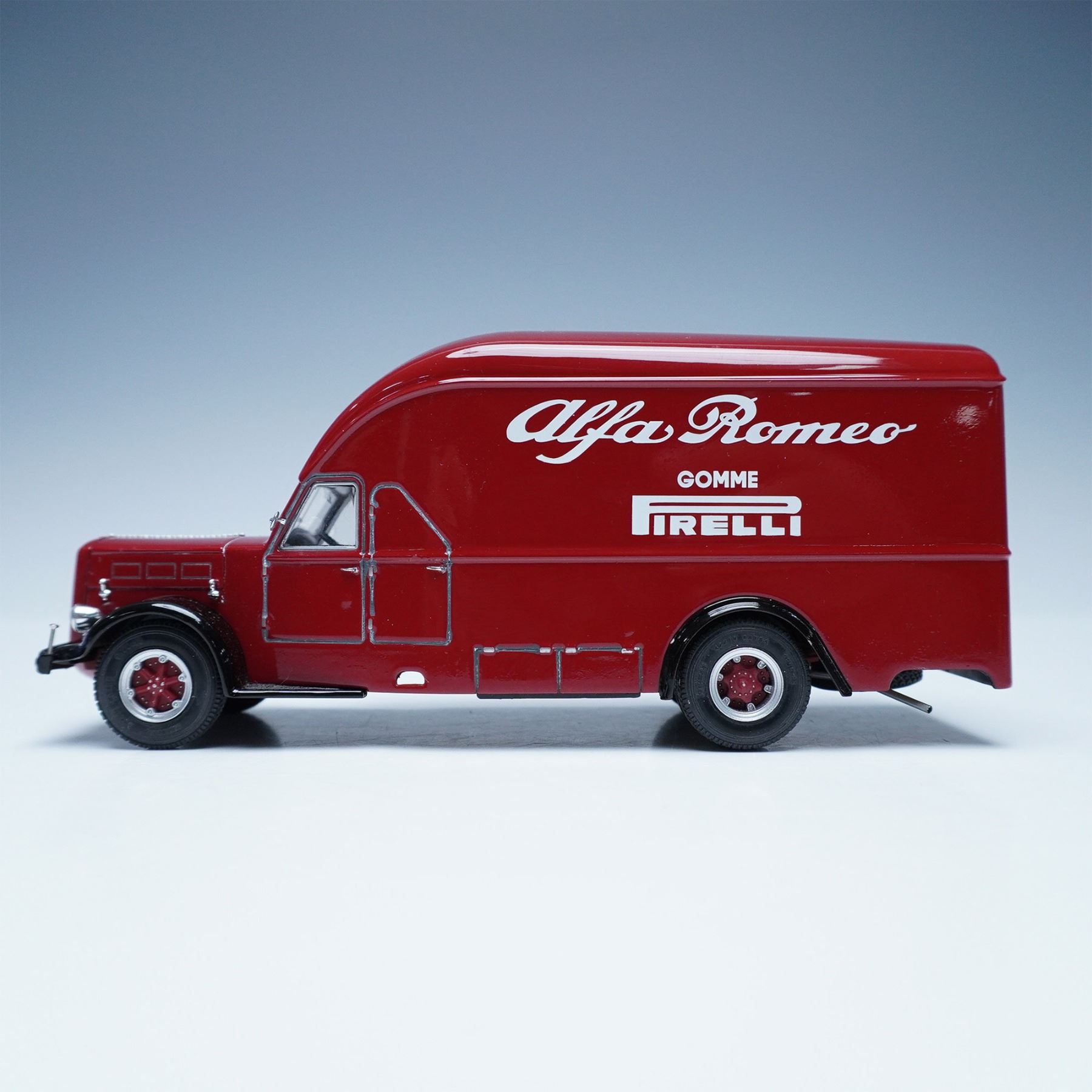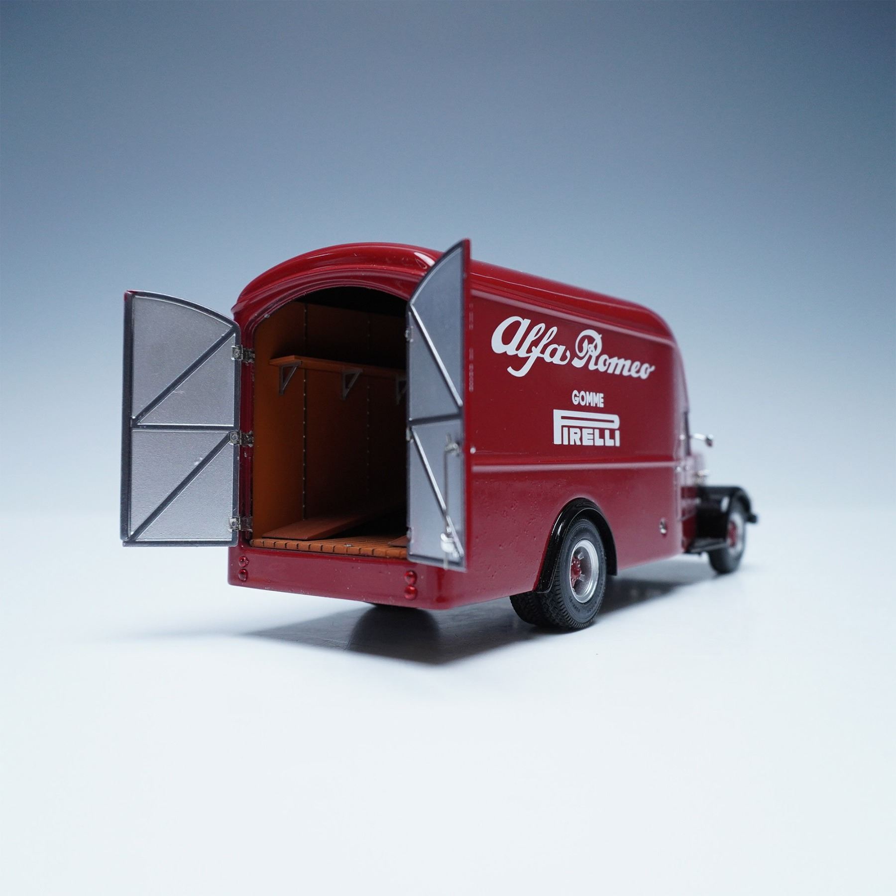 This 1:43 scale die-cast model replicates the iconic Alfa Romeo van used for Pirelli tire transport. Featuring detailed construction, opening rear doors, and an accurately reproduced chassis, this model is a collector's piece for vintage automotive enthusiasts. Presented in its original box, this model highlights the historical partnership between Alfa Romeo and Pirelli.