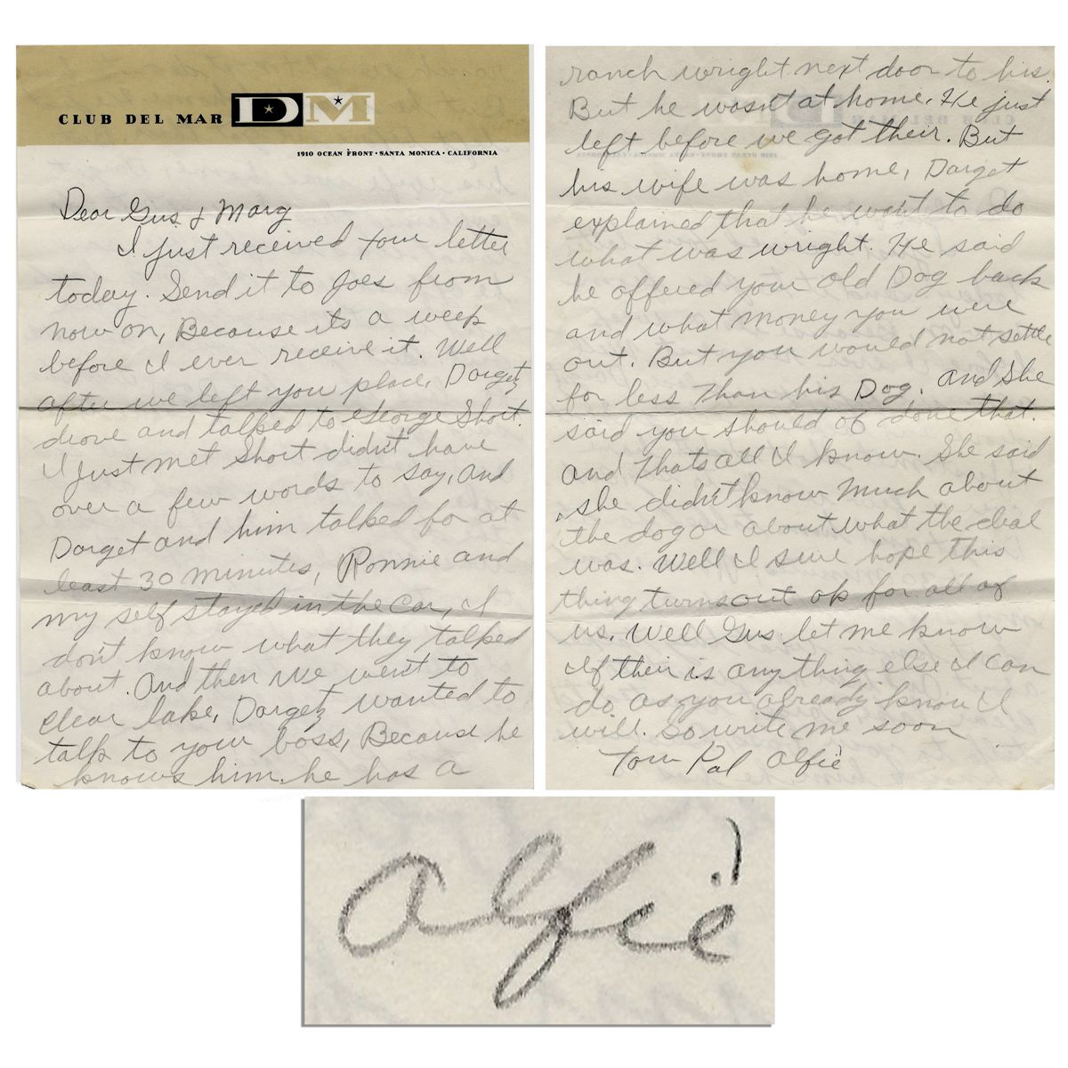 Carl ''Alfalfa'' Switzer, of ''Our Gang'' renown, autograph letter signed ''Alfie'', on ''Club Del Mar'' stationery. Postmarked 18 December 1953, from Los Angeles, California. Letter, in pencil, discusses a bizarre dispute over a longstanding debt involving a dog. Reads in part: ''Dear Gus & Marg, I just received your letter today. Send it to Joes from now on, because its a week before I ever receive it. Well after we left your place, Dorget drove and talked to George Short. I just met Short didn't have over a few words to say, and Dorget and him talked for at least 30 minutes, Ronnie and myself stayed in the car, I don't know what they talked about. And then we wanted to talk to your boss, because he knows him. He has a ranch wright [sic] next door to his. But he wasn't at home. He just left before we got their. [sic] But his wife was home, Dorget explained that he wanted to do what was wright [sic]. He said he offered your old Dog back and what money you were out. But you would not settle for less than his Dog…She said she didn't know much about the dog or about what the deal was…'' Signed ''Your Pal Alfie''. One page letter, front and verso, measures 7.25'' x 10.5'', with folds from mailing. Also includes original envelope, with a terrific ''Alfalfa Switzer / Professional Bear Hunter'' return address. (Switzer supplemented his adult acting career as a hunting guide.) Near fine.
