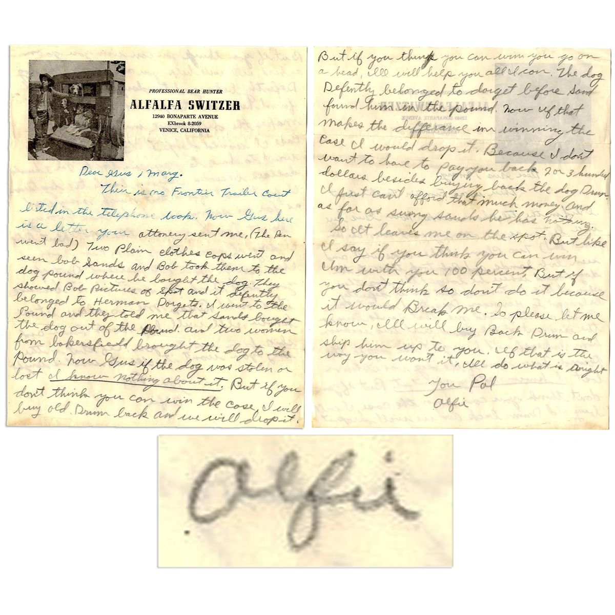 Beloved ''Little Rascal'' Carl Switzer autograph letter signed, postmarked 20 March 1954. Letter discusses Switzer's efforts to help his friend, the letter's recipient, resolve a conflict regarding his dog. Signed ''Alfie''. Two page letter, front and verso, measures 8.5'' x 11'', with folds from mailing. ''Professional Bear Hunter'' letterhead includes a photo of Switzer standing beside his hunting dogs. Also includes original envelope, with a second signature, ''C. Switzer'', below the return address. Near fine.