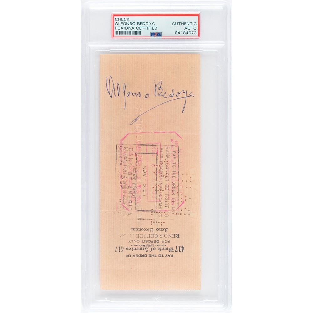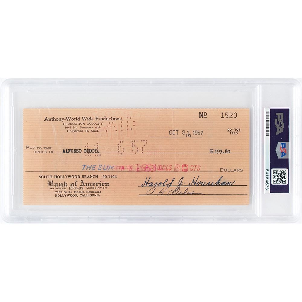Anthony-World Wide Productions check, 7.25 x 3, filled out in type and made payable to Alfonso Bedoya for $193.80, October 23, 1957. Endorsed on the reverse in blue ballpoint by Bedoya. In fine condition. Encapsulated in a PSA/DNA authentication holder.