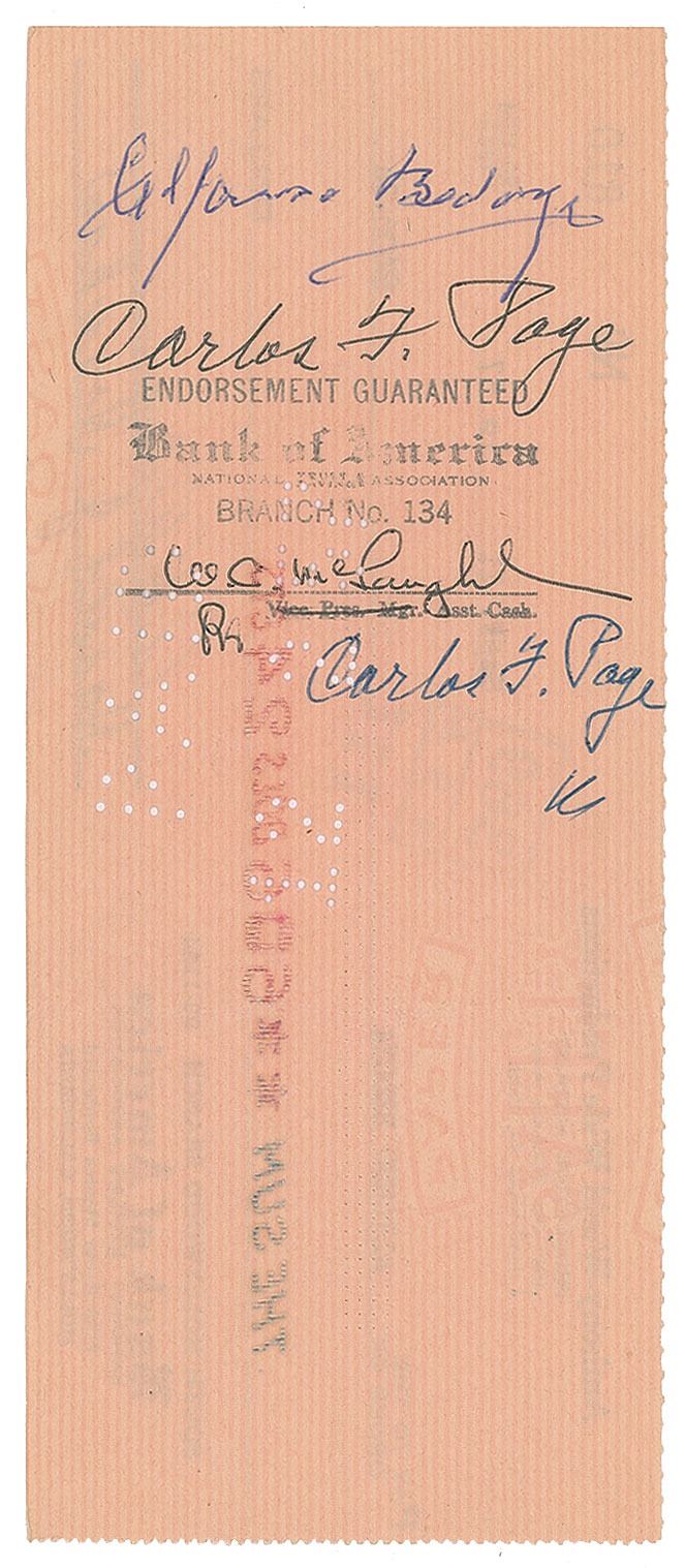 Mexican character actor (1904–1957) in the U.S. and Mexican film industries in the 1930s to 1940s, who is perhaps best remembered for his line in John Huston's 1948 adventure film The Treasure of the Sierra Madre, 'I don't have to show you any stinking badges.' Anthony–World Wide Productions business check, 7.25 x 3, filled out in type and made payable to Alfonso Bedoya for $606.24, September 11, 1957. Endorsed on the reverse in blue ballpoint by Bedoya. In fine condition.