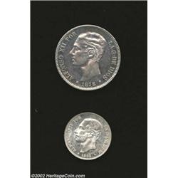 Alfonso XII 5 Pesetas 1878DE-M, KM676, XF+, lightly cleaned and 2 Pesetas 1882 KM678, BU, numerous s