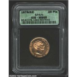Alfonso XII Gold 25 Pesetas 1876, restrike dated 1962, MS65 ICG. Important notice: We expect to be auctioning lots at the rate of 200-250 per hour. Sometimes eBay Premier live bid software cannot keep up with that pace, so we strongly recommend that you place a realistic proxy bid now as insurance to avoid disappointment. Also please note that all Heritage/CAA lots purchased through eBay Premier carry a 20% Buyer's Premium. Please make sure you read the Terms and Conditions.