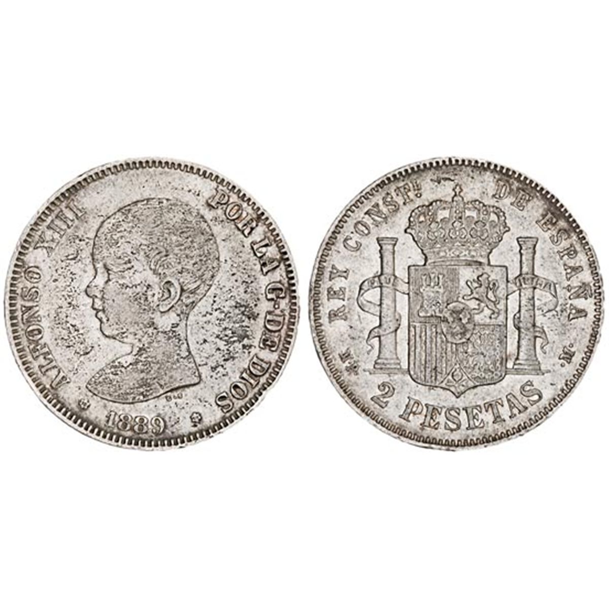 2 pesetas. 1889*18-89. Madrid. MPM. Segunda estrella poco visible. Plata agria. CAL-29. Ar. MBC-.