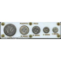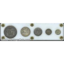 Alfonso XIII Complete denomination set, including the Peso 1895 VF+ minor handling, 40 Centavos 1896 VF cleaned, 20 Centavos 1895 VF-XF cleaned, 10 Centavos 1896 VF+ cleaned and 5 Centavos 1896 VF-XF cleaned. All housed in a custom plastic holder. Important notice: We expect to be auctioning lots at the rate of 200-250 per hour. Sometimes eBay Premier live bid software cannot keep up with that pace, so we strongly recommend that you place a realistic proxy bid now as insurance to avoid disappointment. Also please note that all Heritage/CAA lots purchased through eBay Premier carry a 20% Buyer's Premium. Please make sure you read the Terms and Conditions.