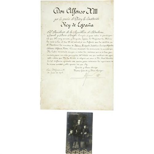 <B>Alfonso XIII, King of Spain, Document Signed.</B></I> "<I>Alfonso RH</B></I>" one page 9.5" x 14", San Ildefonso, June 29, 1908, in Spanish. This document, accompanied by a 3.25 x 5.25 postcard, is addressed to the President of the Republic of Honduras. Alfonso XIII ascended to the throne in 1886 and reigned throughout remarkably tumultuous times, including the first World War, the Second Spanish Revolution, and the rise of Franco. Approximately fourteen punctures along left margin appear to have come from a binding, otherwise the document is in very good condition.<BR><BR><b>Shipping:</b> Flat Material, Small (<a target="_blank" href="http://www.heritageauctions.com/common/shipping.php">view shipping information</a>)