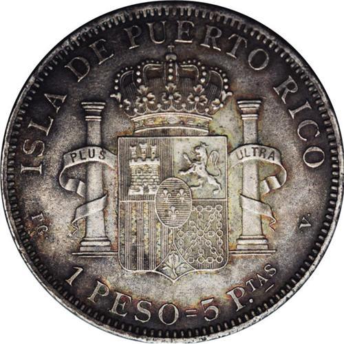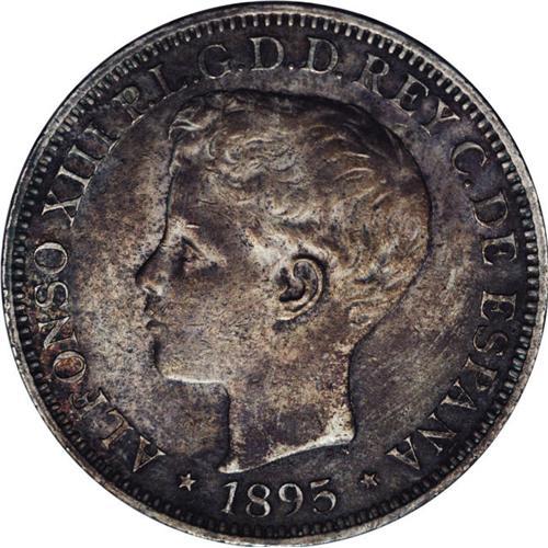 <B>Alfonso XIII Peso 1895 PGV,</B></I> KM-24, XF with old dark gray toning, pleasant enough.<BR><BR><b>Shipping:</b> Coin/Currency (<a target="_blank" href="http://www.heritageauctions.com/common/shipping.php">view shipping information</a>)