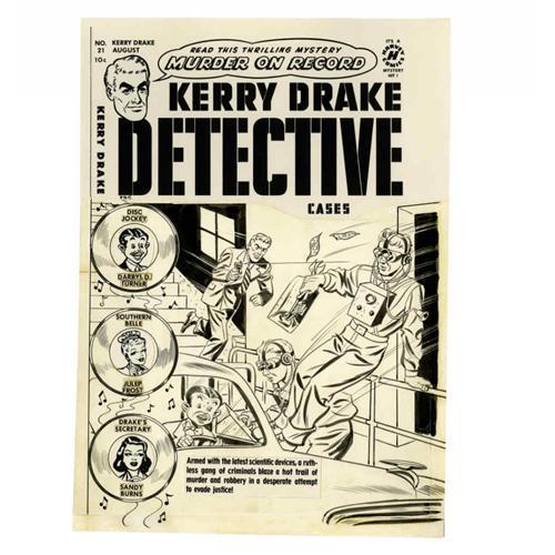 <B>Alfred Andriola - Kerry Drake Detective Cases #21 Cover Original Art (Harvey, 1950).</B></I> Chief investigator for the D.A., Kerry Drake, faces down a ruthless gang of criminals, armed with the latest scientific devices, who are blazing a hot trail of murder and robbery, in this cover illustration by series creator, Alfred Andriola. The image area measures 13" x 17.5", and, aside from some slight glue staining around some of the paste-up copy, the work is in Excellent condition. The logo and masthead paste-ups are not original, but recent photocopy replacement art. Includes a copy of <B>Kerry Drake Detective Cases</B></I> #21.
