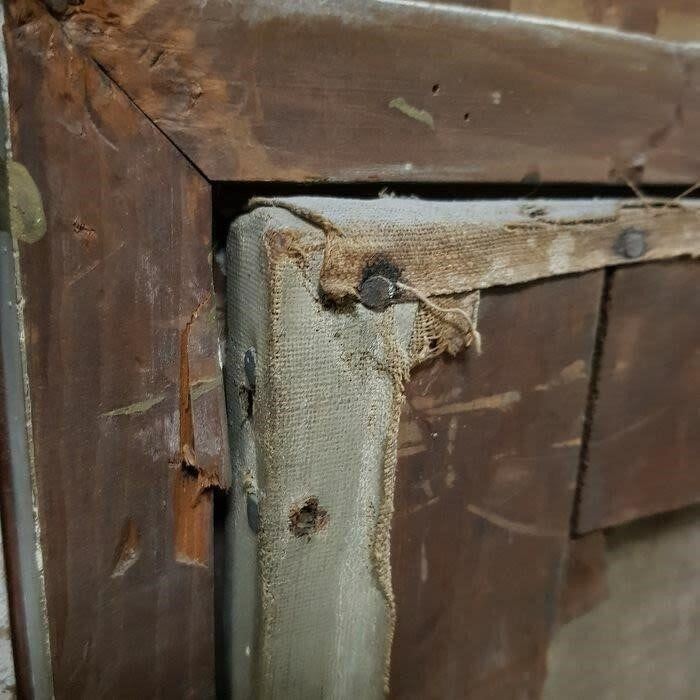 Condition: There is damage to the frame and canvas as shown in the pictures, and the canvas is detached from the frame.