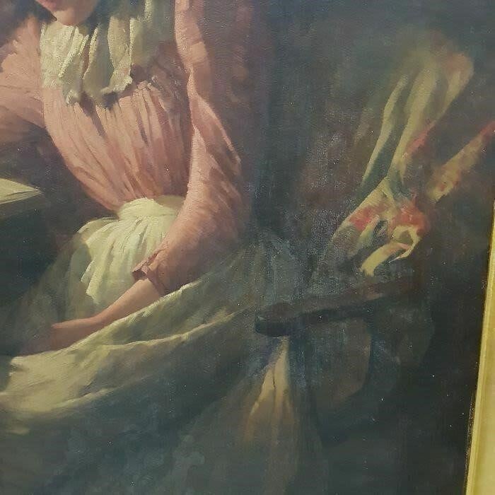Oil on canvas depicting “An Interesting Story”, signed A. Glendenning 1892 on bottom left.