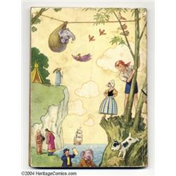 <B>Alfred Bestall - Rupert in More Adventures (The Daily Express, 1945).</B></I> When Mary Tourtel created Rupert the Bear in 1920, she most likely had no idea how long-lasting the character's popularity would be. By the time she retired from the strip in 1935 due to difficulties with her eyesight, Rupert was a true phenomenon. Beloved by young and old alike, Rupert survived the Second World War (and it's accompanying paper shortages), as well as changing public tastes, and is still published in Great Britain to this day. The Annuals (a tradition begun by Alfred Bestall, Mary Tourtel's hand-picked successor as artist of the little brown bear), have proven terrifically collectible, and early editions are eagerly sought by modern collectors. The piece offered here, the Annual from 1945 is in Very Good condition, with some creasing and corner rounding on the front and back covers, as well as the inscription, "Colin Mansi, 1945, 9 years" on the first page (the price of 3'6 on that page is unclipped). There is a small abrasion on the front cover, which has resulted in a small amount of paper loss. The maze on the first page is unmarked, but the hidden picture puzzle on the last page bears some coloring. All in all, this is a very attractive and presentable book, with only some minor foxing throughout. Otherwise, the pages are white and supple, with beautiful rich colors. An appealing, and hard-to-find, book for any collector. <BR><BR><B>Important notice:</B> Heritage usually auctions material at the rate of 200-250 lots per hour. On some occasions eBay Live bid software or the Internet may not be able to keep up with the pace of the auction. We recommend placing a realistic absentee bid now as insurance to avoid disappointment. Occasionally the auctioneer may eliminate or reject an eBay Live bid, and the auctioneer may also reopen a lot after the close of the eBay live bidding (usually because we missed an audience bid), and may reject your bid even if it shows you as the winning bidder. By bidding via eBay Live, you agree that Heritage may award the lot to another bidder at its sole discretion under the circumstances described above or any other reasonable circumstances. Since eBay bids are not shown to us until we open the lot on the floor, we treat those bids just like floor bids. In most cases the floor responds before the eBay bid is presented to us, due to Internet lag time, so for consistency we have made it a policy that floor bids are always considered first over tie eBay live bids. Also please note that all Heritage lots purchased through eBay Live carry a 20% Buyer's Premium. Please make sure you read the Terms and Conditions before you bid.