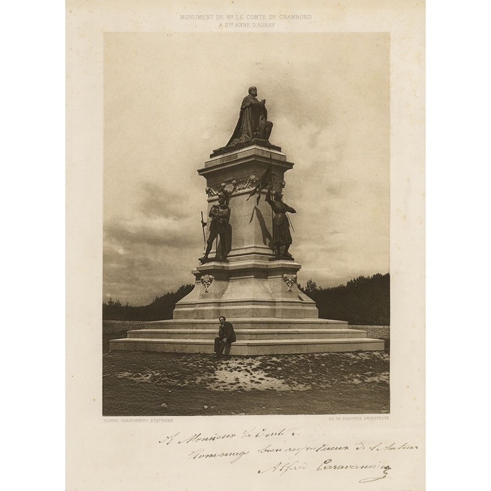 French sculptor (1855–1917) who studied under Aimé Millet. Uncommon 9.5 x 12.75 photogravure of the Monument de Mr. le Comte de Chambord, signed and inscribed in the lower border in ink by Caravanniez. In fine condition, with lightly trimmed edges and some scuffing to the inscription, evidently to remove the recipient's surname.