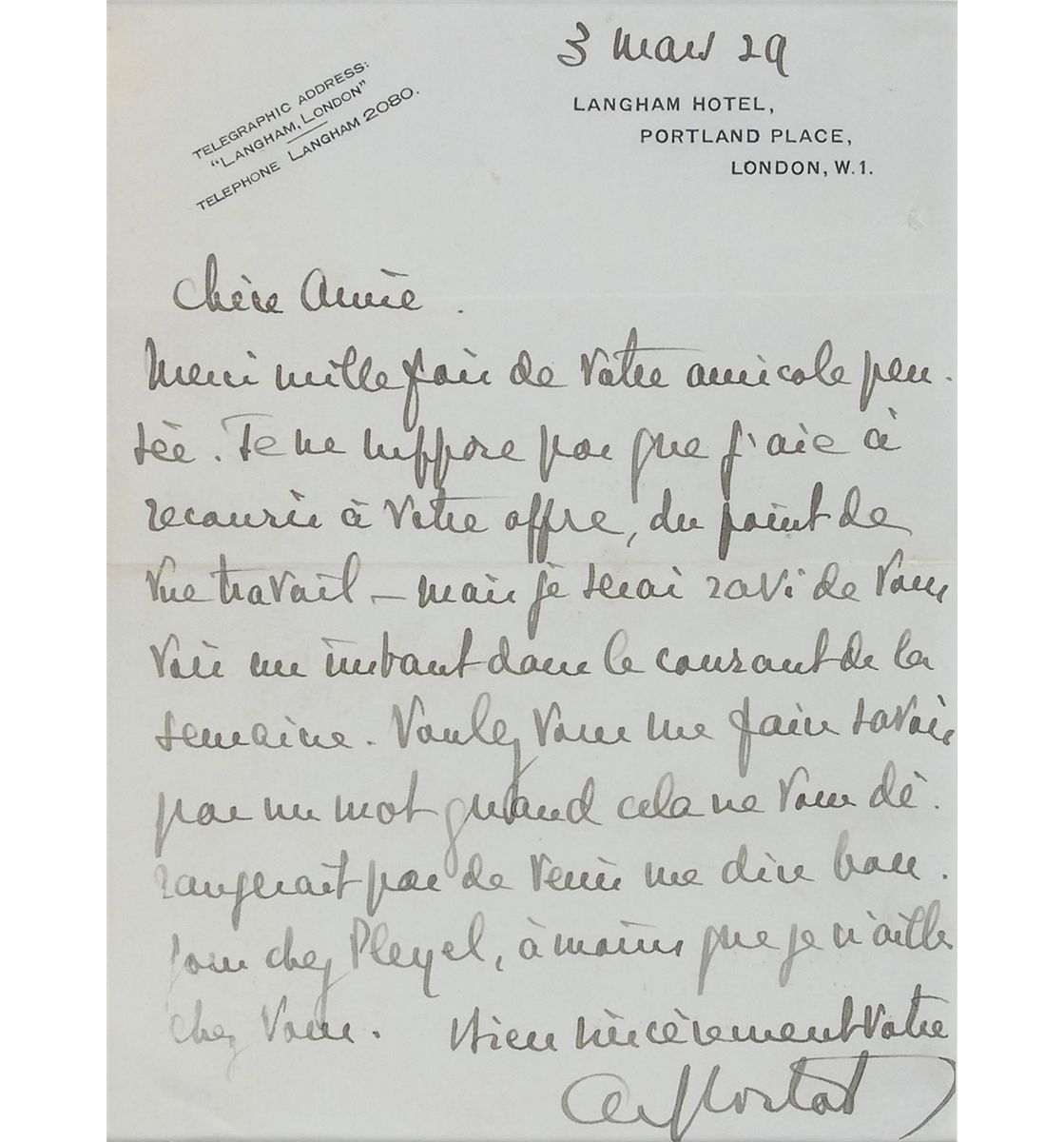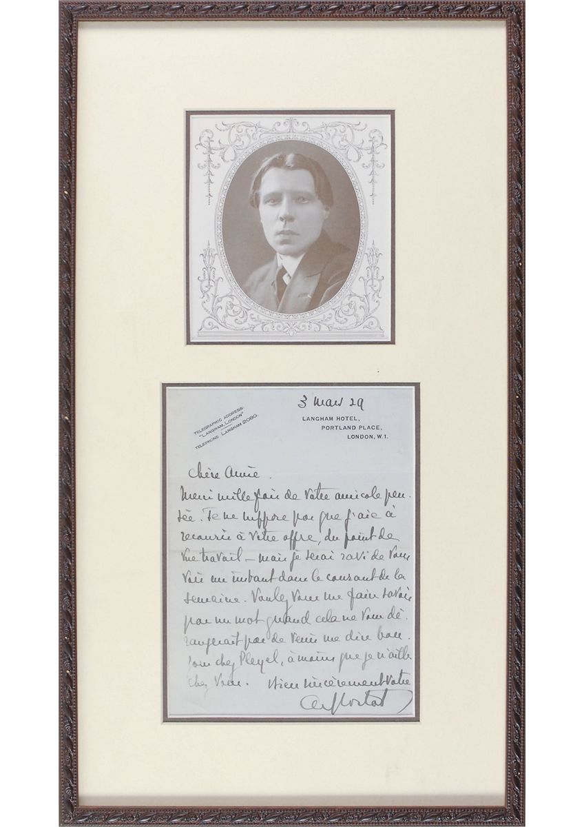 ALS in French, one page, 5 x 6.75, Langham Hotel letterhead, March 3, 1929. Untranslated. Attractively double-matted and framed with a portrait of Cortot to an overall size of 9.75 x 17. In fine condition.