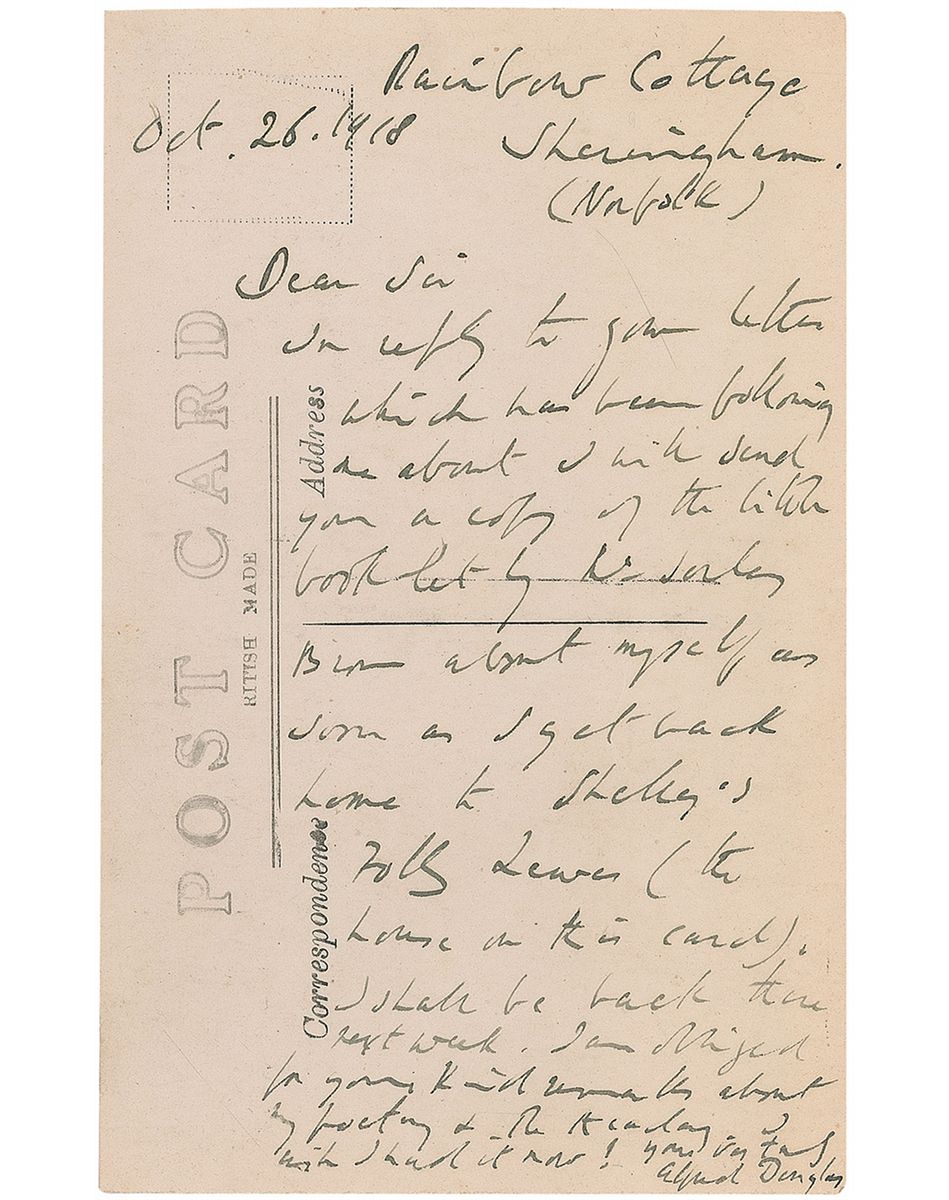 British writer (1870–1945) who first came to prominence in the 1890s as the young intimate companion of Oscar Wilde. After Douglas’s father, Lord Queensbury, accused Wilde of being a “somdomite” [sic], Wilde filed the libel lawsuit that led to his own conviction and two-year prison term. ALS, one page on a postcard of Shelley’s Folly, 3.5 x 5.5, October 26, 1918. A letter to a gentleman written on the reverse of a postcard. In full: “In reply to your letter which has been following me about I will send you a copy of the little booklet by N…about myself as soon as I get back home to Shelley’s Folly Lewes (the home on this card). I shall be back there next week. I am obliged to your kind remarks about my poetry & the Academy. I wish I had it now!” In fine condition, with a few creases. Accompanied by the original mailing envelope, addressed in Douglas’ hand.