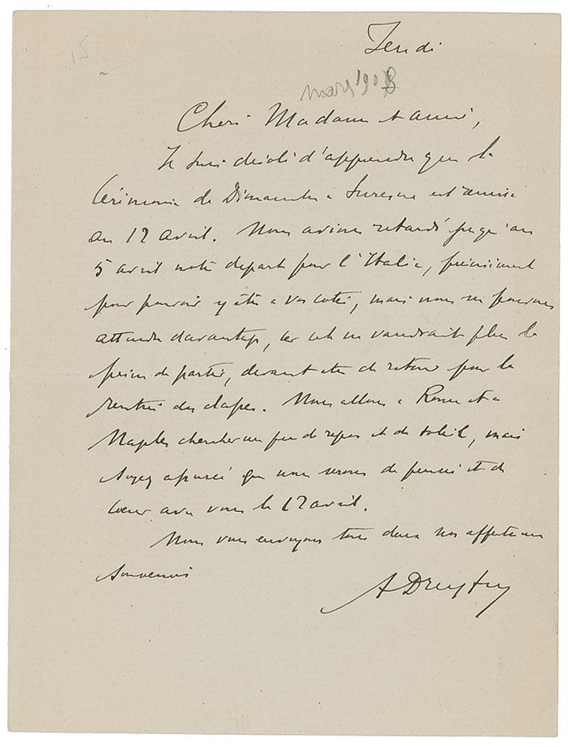 ALS in French, signed “A. Dreyfus,” one page, 4.5 x 6, no date (but bearing a pencil notation of “May 1908” in an unknown hand). Letter to the widow of Emile Zola, in full (translated): “Dear Madame and friend [male], I am sorry to learn that Sunday’s ceremony in Suresnes [West of Paris] is postponed to April 12. We had delayed until April 5 our departure to Italy, precisely to be able to attend by your side, but we cannot delay any longer because what would be the point of leaving then since we have to be back when school starts. We are going to Rome and to Naples to get a little rest and sunshine, however, be assured that our thoughts and heart will be with you on April 12. With fond memories to you both.” In fine condition.