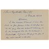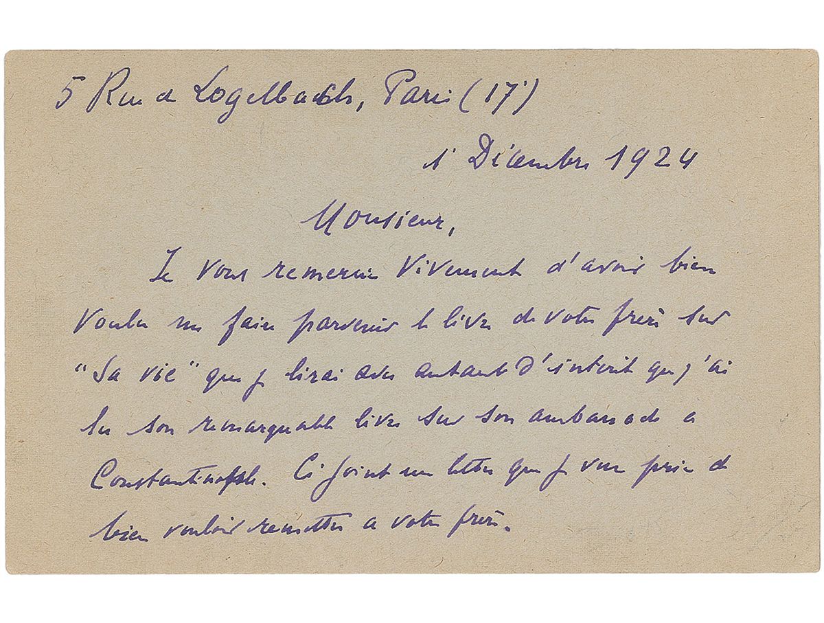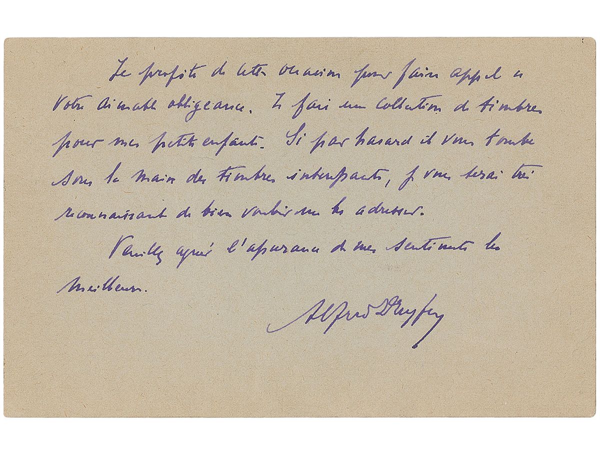 French military officer (1859–1935) whose central role in the Dreyfus Affair, which tore French society apart and shook their faith in the military, thrust him into the international spotlight. ALS in French, one page both sides, 5.25 x 3.5, December 1, 1924. Letter to an unidentified recipient. In full (translated): “Thank you kindly to have been willing to send me your brother’s book about ‘His Life’ that I will read with as much interest as I have read his remarkable book about his embassy in Constantinople. Herewith is a letter that I am asking if you would please give to your brother. I am taking this opportunity to appeal upon your kindness. I am collecting stamps for my grandchildren. If by chance you come across interesting stamps, I would be very grateful if you would send them to me.” In fine condition.