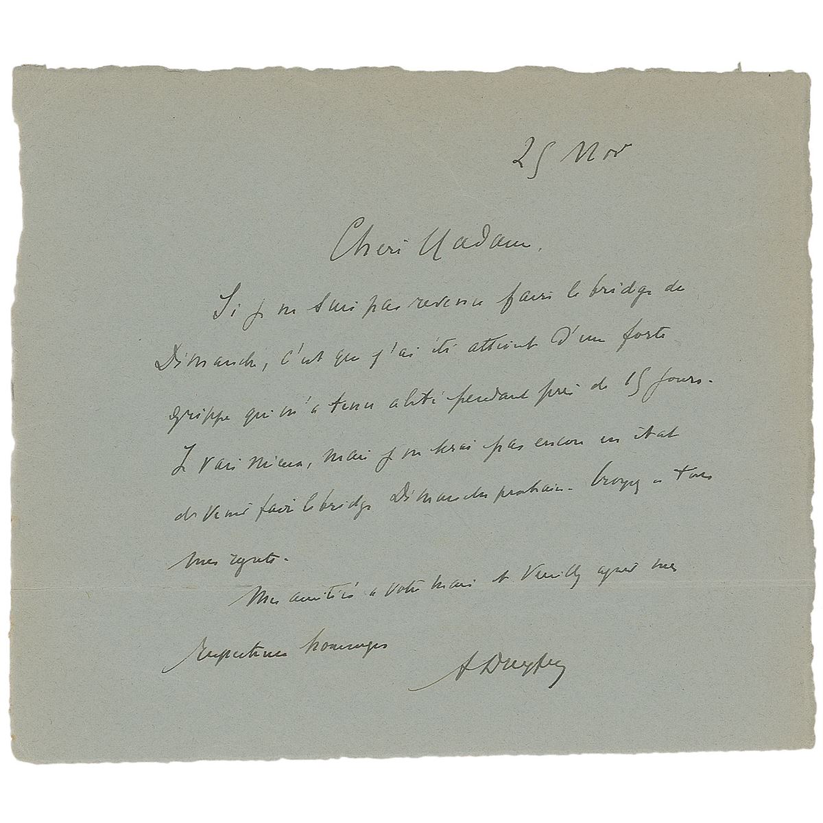 French military officer (1859–1935) whose central role in the Dreyfus Affair, which tore French society apart and shook their faith in the military, thrust him into the international spotlight. ALS in French, signed “A. Dreyfus,” one page, 6.25 x 5.5, November 25, no year. In part (translated): "The reason why I have missed our Sunday bridge parties is that I have been suffering from a bad flu that kept me in bed for about two weeks. I am doing better now, but I will not yet be strong enough to come and play bridge this Sunday.” In fine condition.