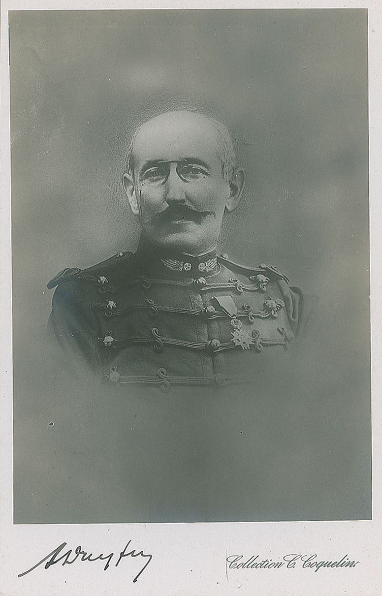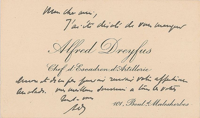 Two items: first-rate 3.5 x 5.5 head-and-shoulders postcard portrait signed "A. Dreyfus" in the lower white border; and a brief untranslated ALS in French on one of Dreyfus's personal 3.75 x 2.25 calling cards, initialed "A. D." at its conclusion. In overall fine to very fine condition. An exceptionally clean pairing of items.