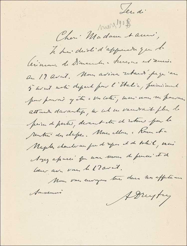 ALS in French, signed “A. Dreyfus,” one page, 4.5 x 6, no date (but bearing a pencil notation of “May 1908” in an unknown hand). In full: “Dear Madame and friend [male], I am sorry to learn that Sunday’s ceremony in Suresnes [West of Paris] is postponed to April 12. We had delayed until April 5 our departure to Italy, precisely to be able to attend by your side, but we cannot delay any longer because what would be the point of leaving then since we have to be back when school starts. We are going to Rome and to Naples to get a little rest and sunshine, however, be assured that our thoughts and heart will be with you on April 12. With fond memories to you both.” In fine condition.