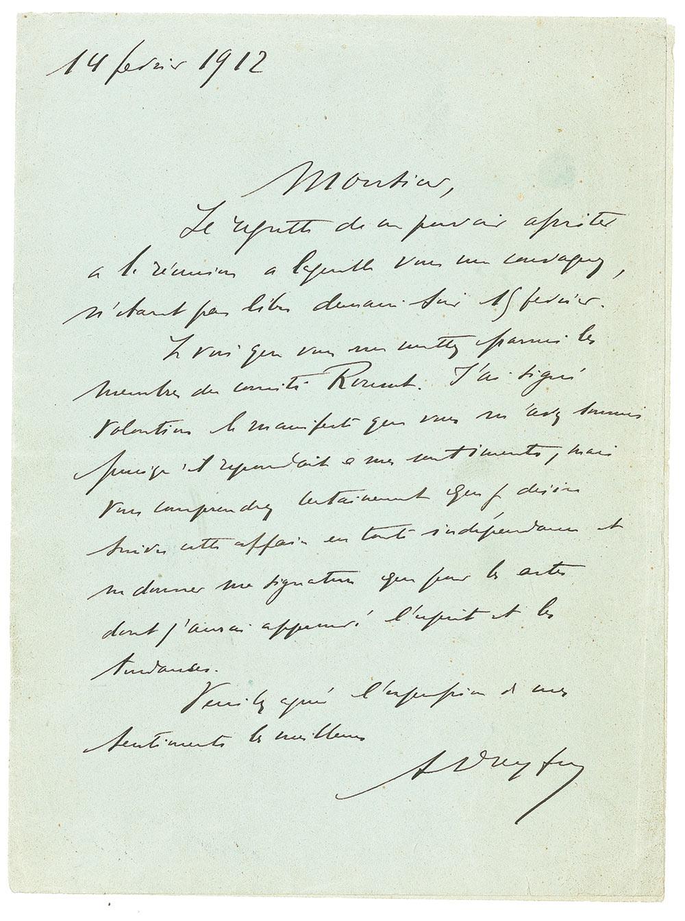 French military officer (1859–1935) whose central role in the Dreyfus Affair, the most sensational cause célèbre in the final years of the 19th century which tore French society apart and shook their faith in the military, thrust him into the international spotlight. Discovering the murky circumstances—the recklessness of the French government in pursuing a speedy conviction, the sloppy procedure of the court-martial—author Emile Zola wrote his famous open letter, “J’Accuse!,” laying bare the entire disgraceful affair. Zola was convicted of libel and fled to England, though he returned to France in time to witness the fall of the government and Dreyfus’s release following an overturned second conviction. ALS signed “A. Dreyfus,” one page, 5.25 x 7, February 12, 1912. Letter to Monsieur de Marmande. In full (translated): “I regret not being able to attend the meeting to which you are convoking me. I am busy tomorrow night February 15. I know that you put me among committee…members. I have voluntarily signed the manifesto that you have given me because it represented my feelings, but you certainly understand that I want to follow this affair quite independently and give only a signature to the ones I would have approved the spirit and orientations.” Light creasing and wrinkling, mainly to right edge, a light vertical crease through signature, and some scattered light toning, otherwise fine condition. Accompanied by the original mailing envelope addressed in Dreyfus’s hand, as well as a Sotheby’s auction presentation folder. Dreyfus, having found freedom through the work of one writer, here writes de Marmande (1875-1949), noted French anarchist and journalist who played an active role in radical movements in France. In 1912, the year of this letter, he was part of an effort involving yet another military scandal. This was the “Aernoult-Rousset” matter, stemming originally from the alleged murder of a prisoner by his officers in one of the Army’s Algerian penal colonies. The case provoked a vigorous intervention by the anti-militarist left and it is probably this affair that Dreyfus is referring to when he agrees to sign Marmande's manifesto.