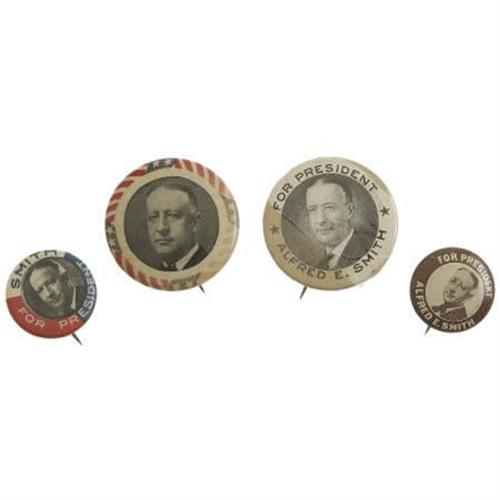 <B>Alfred E. Smith: Four Political Buttons.</B></I> Various sizes. The largest button is 1 1/4” and the smallest 3/4”. Most near very good or better.<BR><BR><b>Shipping:</b> Miscellaneous Collectibles, Smal (<a target="_blank" href="http://www.heritageauctions.com/common/shipping.php">view shipping information</a>)