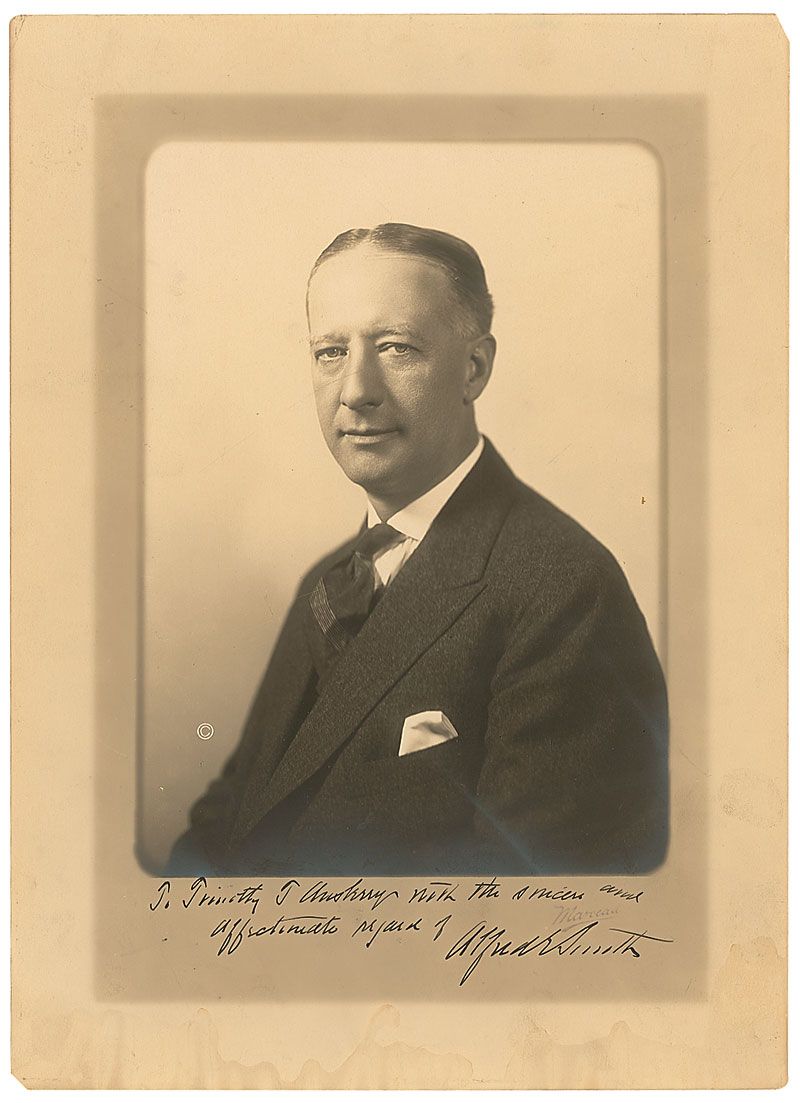 Vintage matte-finish 9.75 x 13.5 portrait by Marceau, signed and inscribed in fountain pen, “To Timothy T. Ansberry, with the sincere and affectionate regards of Alfred E. Smith.” In very good condition, with some dampstaining and soiling to the lower border, slight silvering to dark areas of the image, and a couple small edge chips and tears.