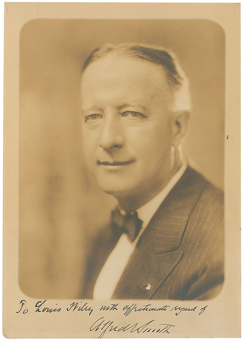 American politician (1873–1944) who served as Governor of New York and who was the unsuccessful Democratic presidential candidate in 1928. Vintage sepia matte-finish 8 x 11 portrait of Smith, signed and inscribed in the lower border in fountain pen, “To Louis Wilson, with affectionate regard of Alfred E. Smith.” Affixed to a same-size mount. Creases to the lower left corner tip, mild overall toning, surface ding to the right border, and silvering to dark areas of the image, otherwise fine condition.