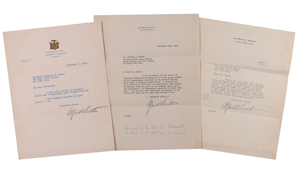 Three TLSs, each one page, approximately 8 x 10.5, personal New York City letterhead, dated between 1925 and 1932. One letter expresses congratulations, while the other two decline invitations. Various light creases and mild soiling, otherwise overall fine condition.