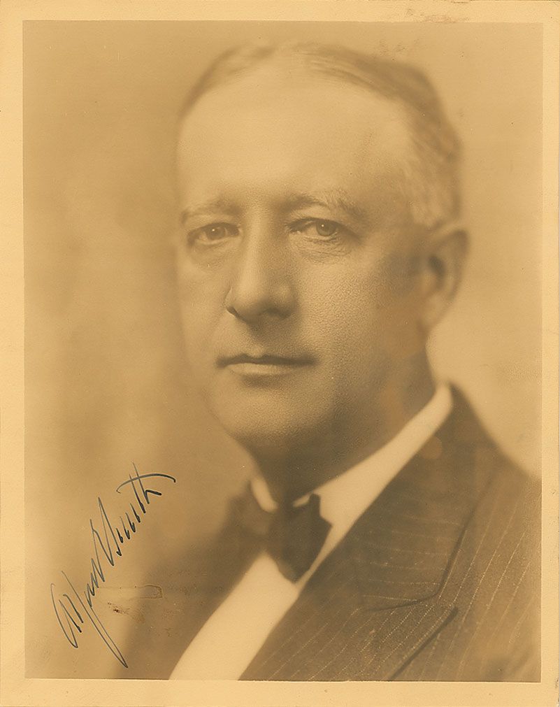 American politician (1873–1944) who served as Governor of New York and who was the unsuccessful Democratic presidential candidate in 1928. Vintage matte-finish 7.75 x 10 head-and-shoulders photo, signed in fountain pen. In very good condition, with some adhesive residue under signature, scattered bends, creases, and toning, and paper remnants to reverse.