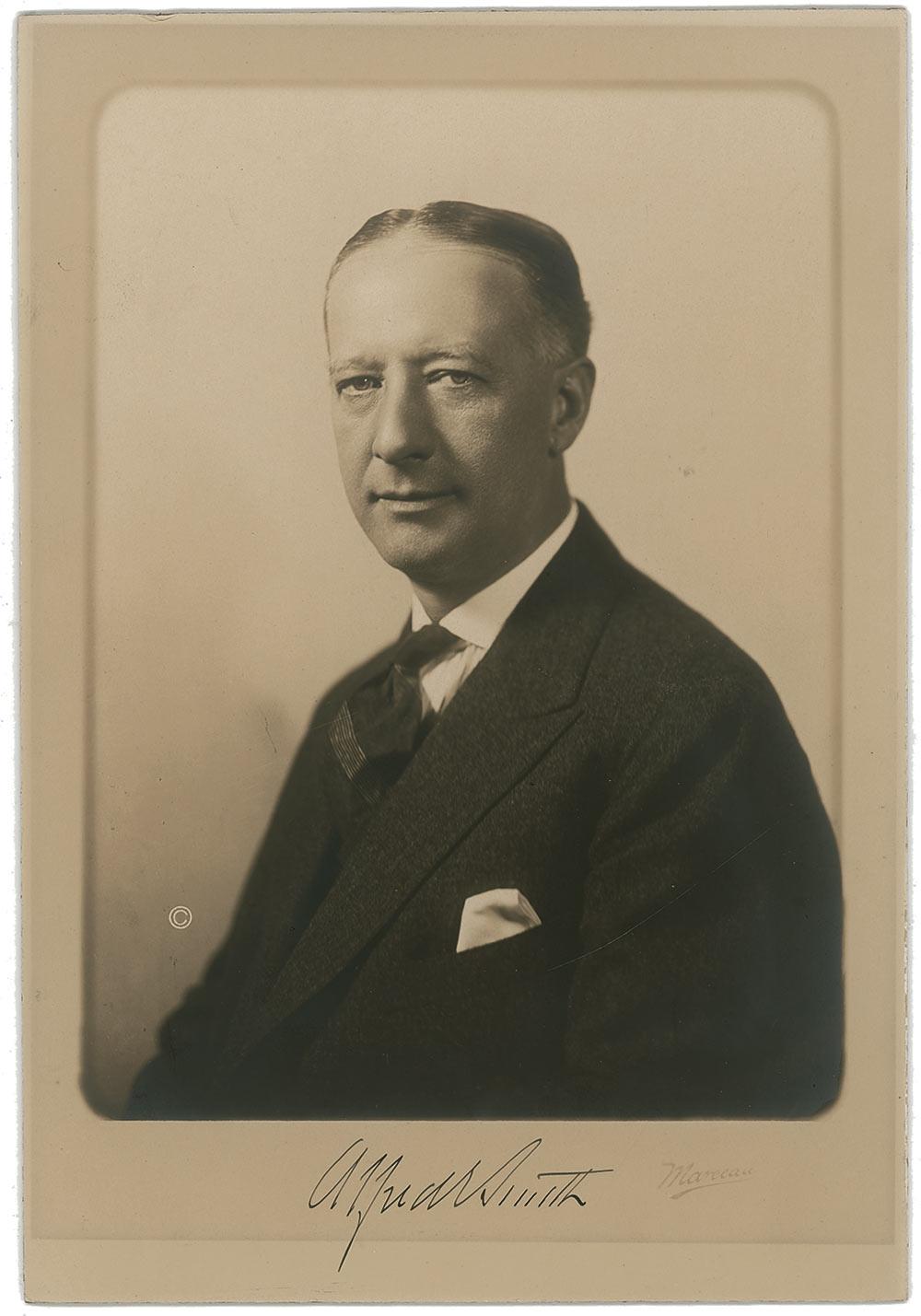 Governor of New York four times, beaten by Hoover in his bid for the presidency in 1928. Vintage matte-finish 8 x 11.5 photo by Marceau, signed in the lower border in black ink. Photo is affixed to an identical size piece of cardboard. In fine condition, with lightly trimmed edges and a bit of scattered light silvering.