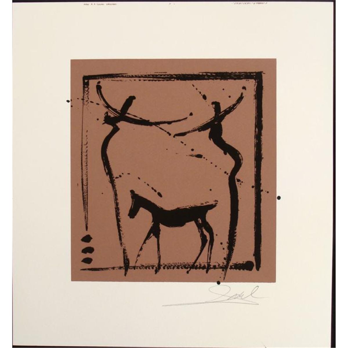 In this abstrarct piece by Alfred Gockel, it appears that a dog is dividing these two "star-crossed lovers." * Artist: Alfred Gockel Medium: Serigraph print on paper Edition: Open Signature: in pencil, lower right Size of Image: 8 3/8" x 9 1/8" Size of Paper: 13 1/8" x 14 1/8" Condition: Excellent Bibliography * The bright colors and the graceful motion of his characters mark Alfred's compositions. This is a perfect reflection of his appearance and inner-self. His hyperactivity is the basis for the large number of different projects he has fulfilled, and his striving for perfection results in the highest quality for each and every one. The competitive nature of his character has led him to an accomplished career, and after 22 years he still gets inspired by society. His creations keep improving, stimulated by a large number of fans, that also keeps increasing. The few spare hours this hasty life gives him, he plays tennis, walks in the German forests with his two dogs, or jumps on two Harley Davidsons with his wife, and drives to their favorite spot at the island Sylt. * From website: http://www.globalgallery.com/artist_biography/alfred+gockel/ *
