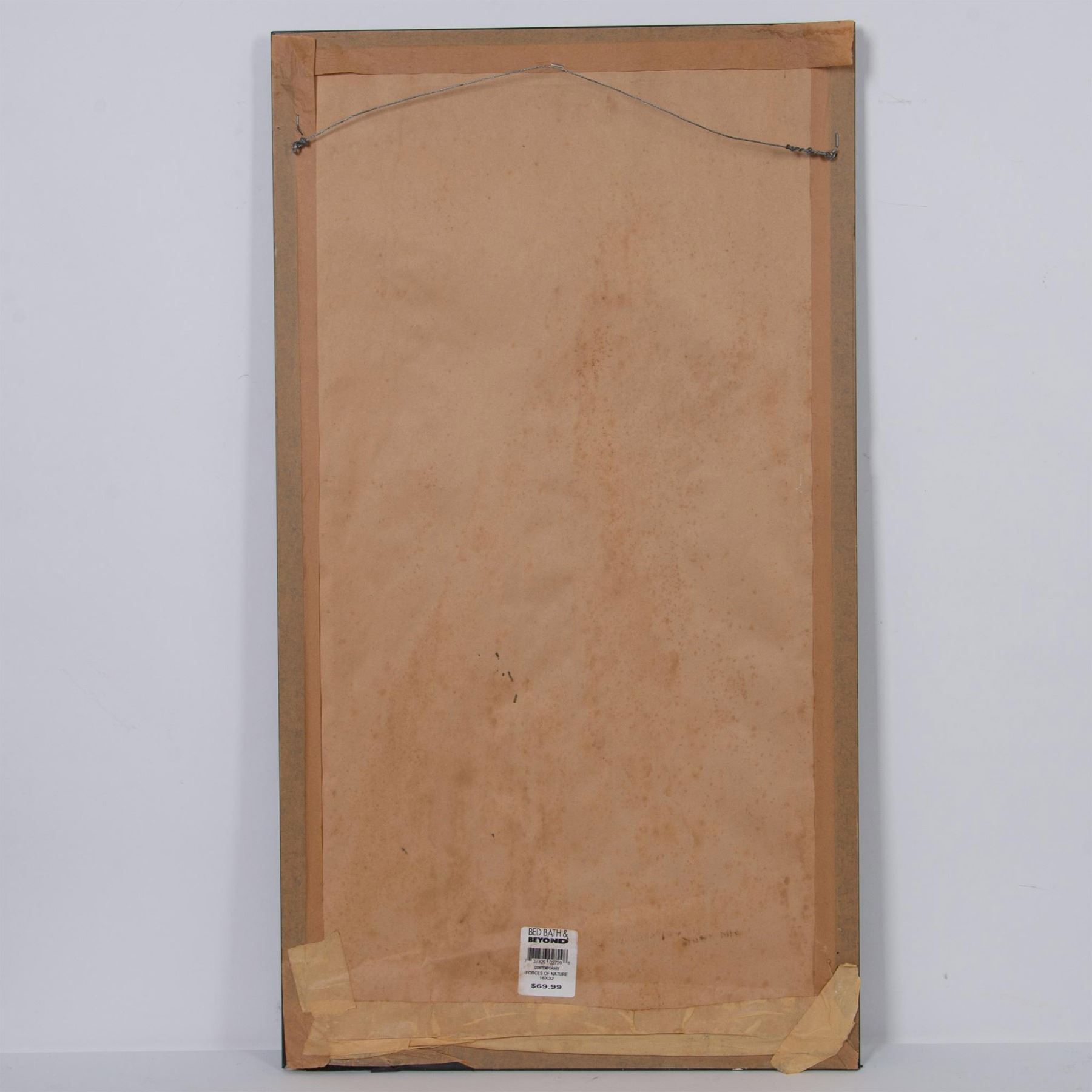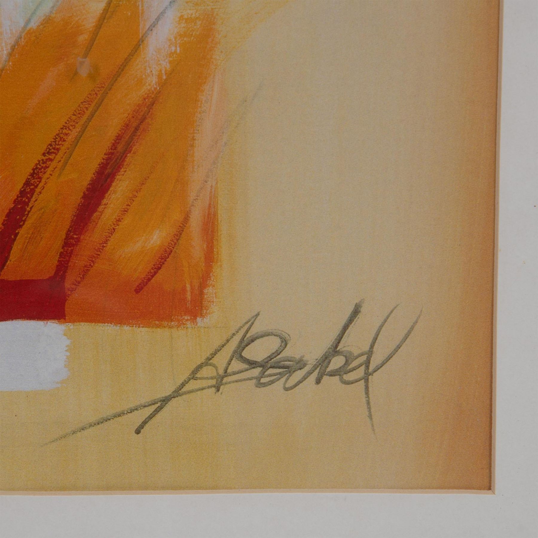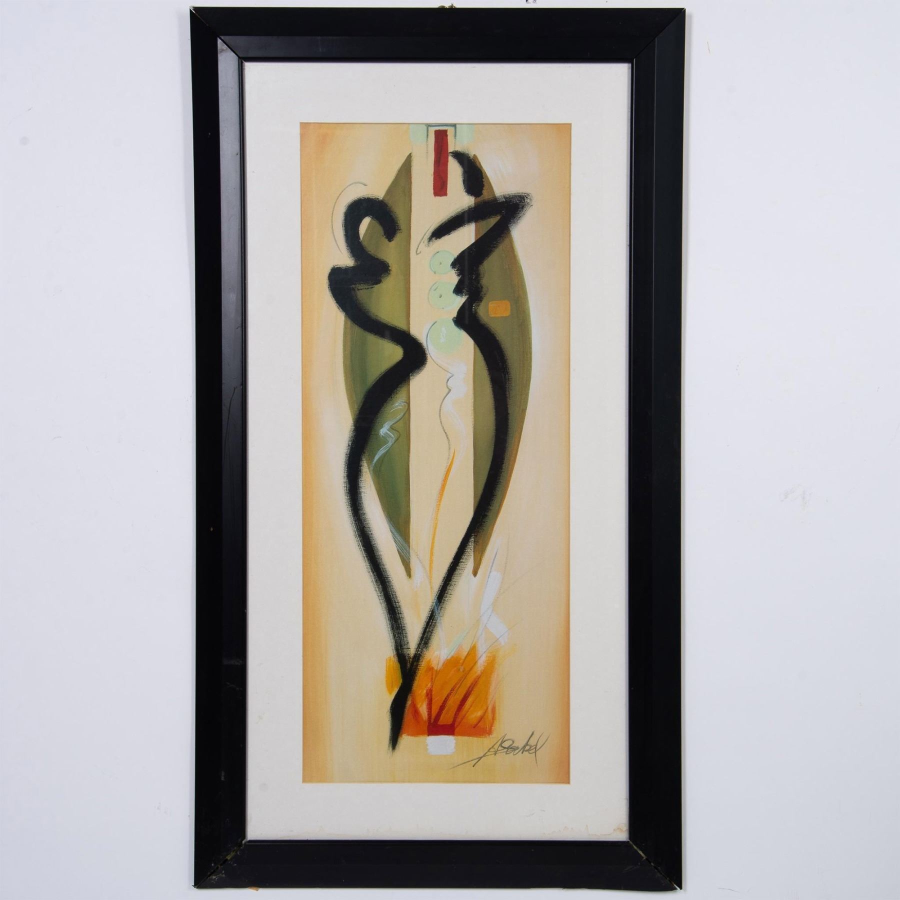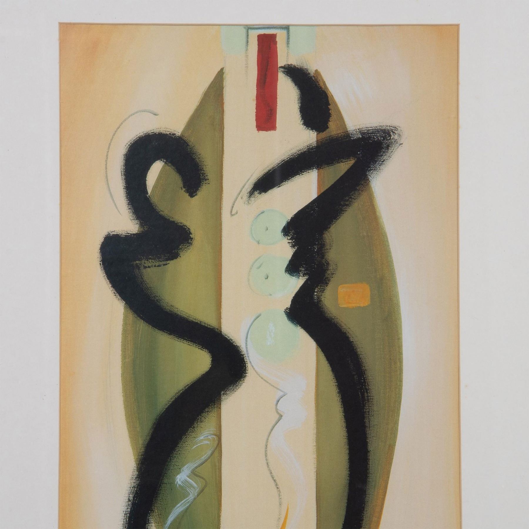 Force of Nature II is a color seriolithograph on paper by German Modernist Alfred Gockel who often performs in front of live audiences to create abstracted artworks with bold colors. Signature in plate on lower right: A. Gockel. Housed in a black wood frame with a white mat. Sight size: 11"L x 27"H. Frame dimensions: 20"L x 36"H x 1.25"W. Artwork can be unframed and rolled for shipment.