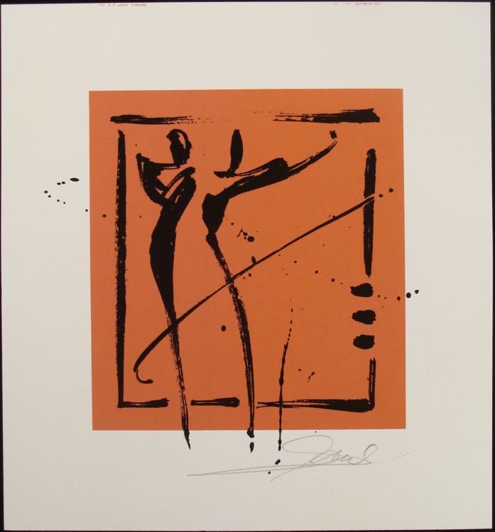 Face forward and march!!Artist: Alfred Gockel Medium: Serigraph print on paper Edition: Open Signature: in pencil, lower right Size of Image: 8 3/8" x 9 1/8" Size of Paper: 13 1/8" x 14 1/8" Condition: Excellent BibliographyThe bright colors and the graceful motion of his characters mark Alfred's compositions. This is a perfect reflection of his appearance and inner-self. His hyperactivity is the basis for the large number of different projects he has fulfilled, and his striving for perfection results in the highest quality for each and every one. The competitive nature of his character has led him to an accomplished career, and after 22 years he still gets inspired by society. His creations keep improving, stimulated by a large number of fans, that also keeps increasing. The few spare hours this hasty life gives him, he plays tennis, walks in the German forests with his two dogs, or jumps on two Harley Davidsons with his wife, and drives to their favorite spot at the island Sylt.From website: http://www.globalgallery.com/artist_biography/alfred+gockel/